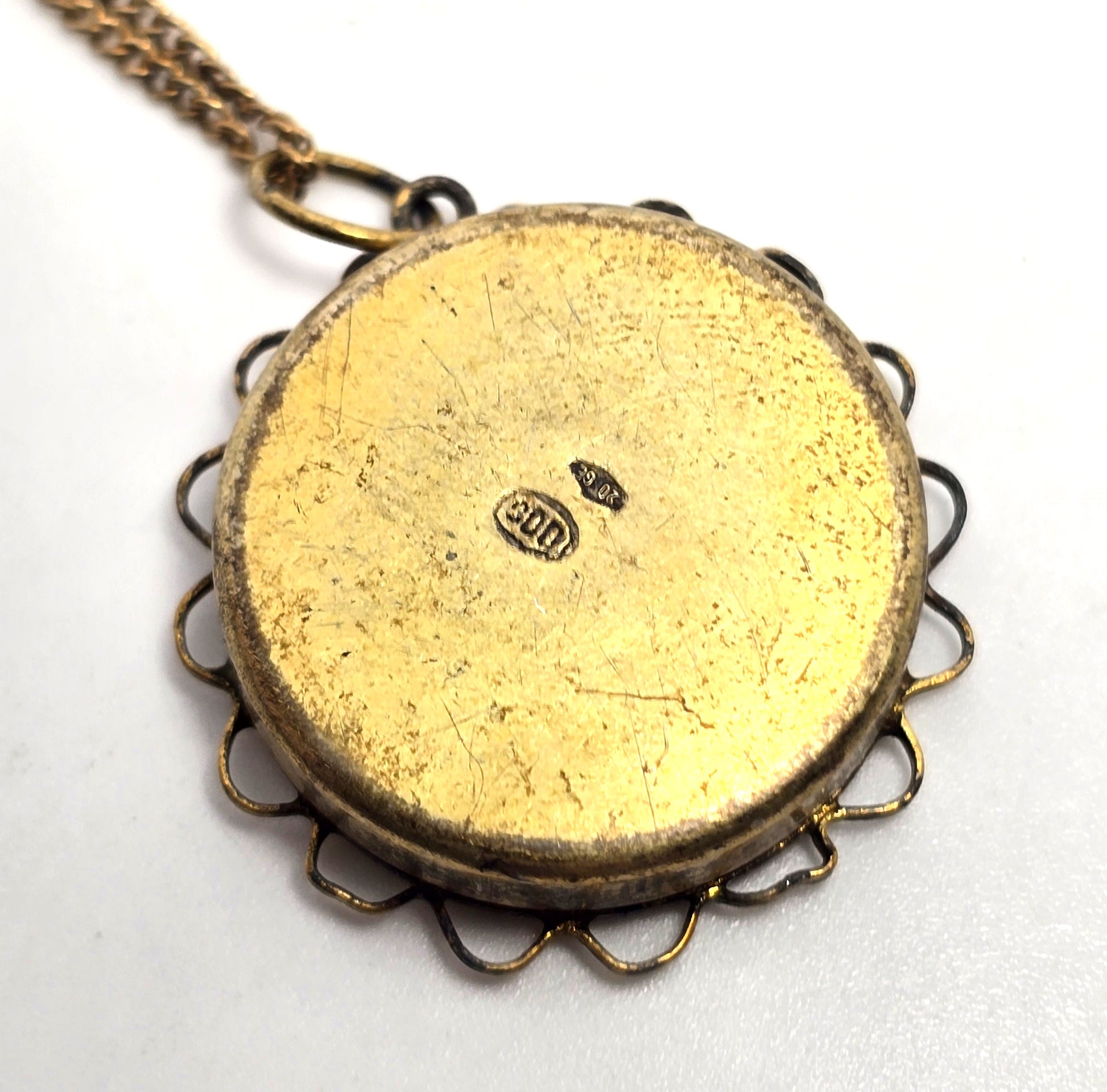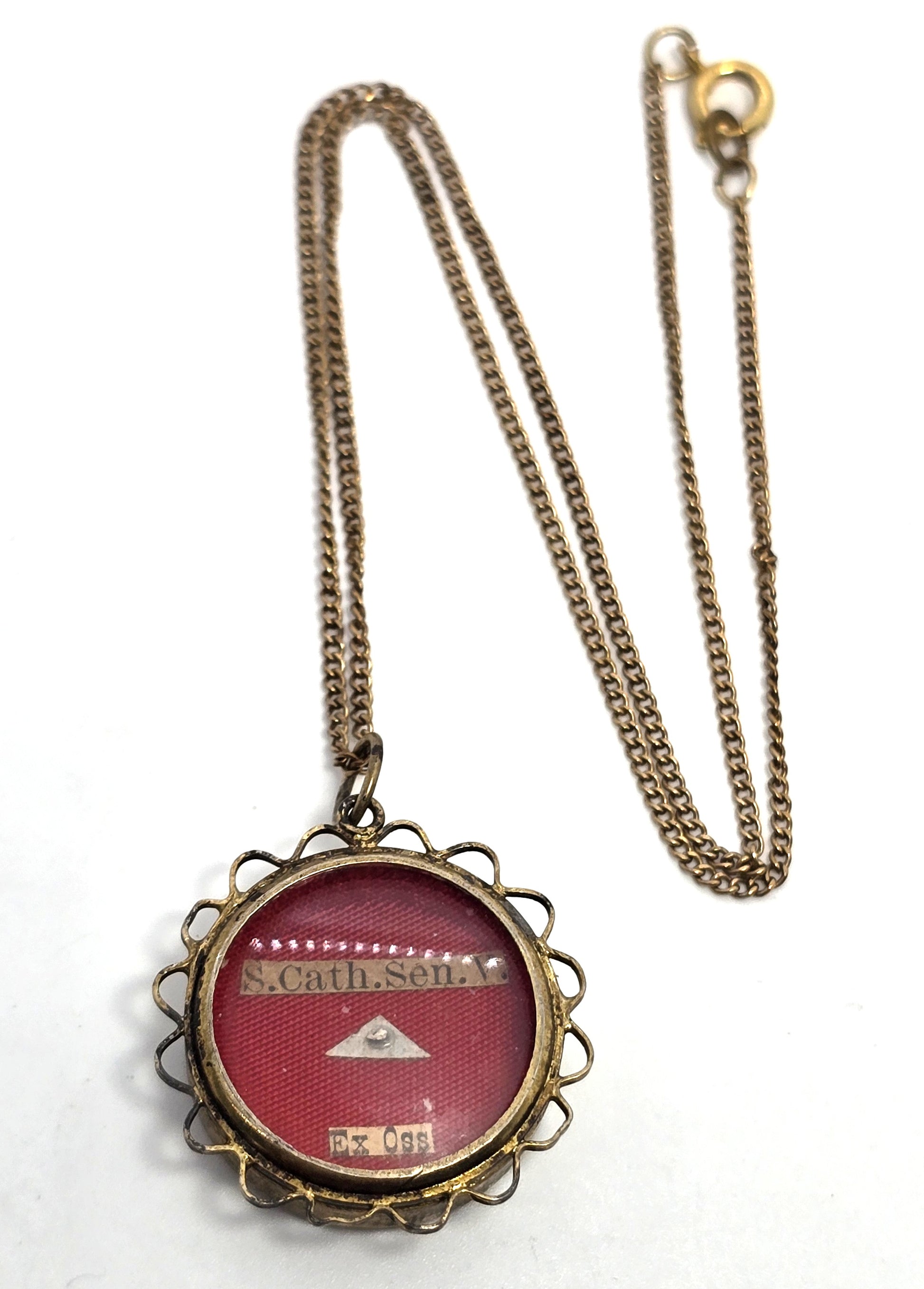 Catholic Reliquary Theca Saint Cath Sen V Ex Oss 800 silver first class relic. This is a first class relic. There is a small natural portion of the Saint. This is a relic marked from Saint Catherine of Siena Virgin. She was an Italian mystic who was influential to the Pope. She was also known as the Doctor of the Church in the late 1400's. She worked hard advocating for the Catholic people in Europe and Italy. Stamped 800 20 GE on the back of the relic. These are silver hallmarks from Italy. The inside opens and the was Papal seal is still intact. The natural portion of the saint is encapsulated in an additional sealed compartment in the center of the reliquary. Reliquary is set under domed convex glass.