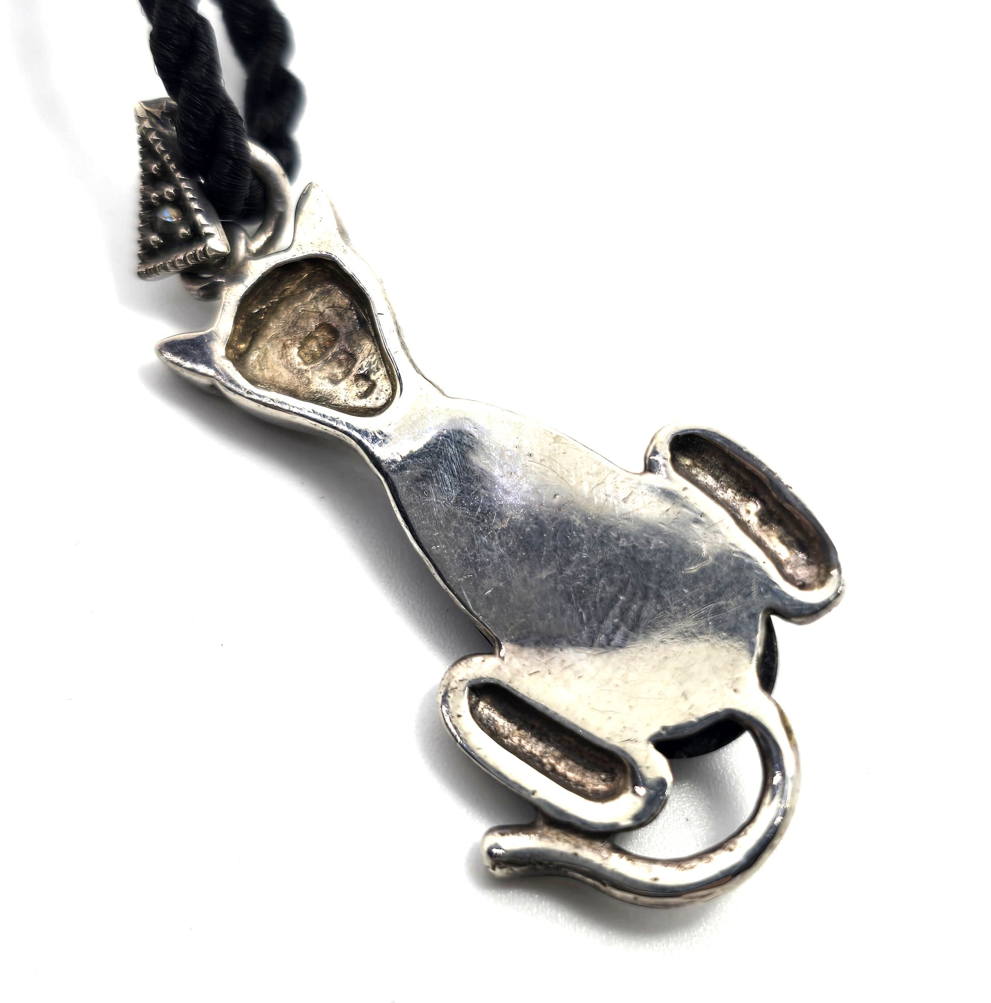 Sitting pretty cat black onyx and marcasite sterling silver retro corded necklace
