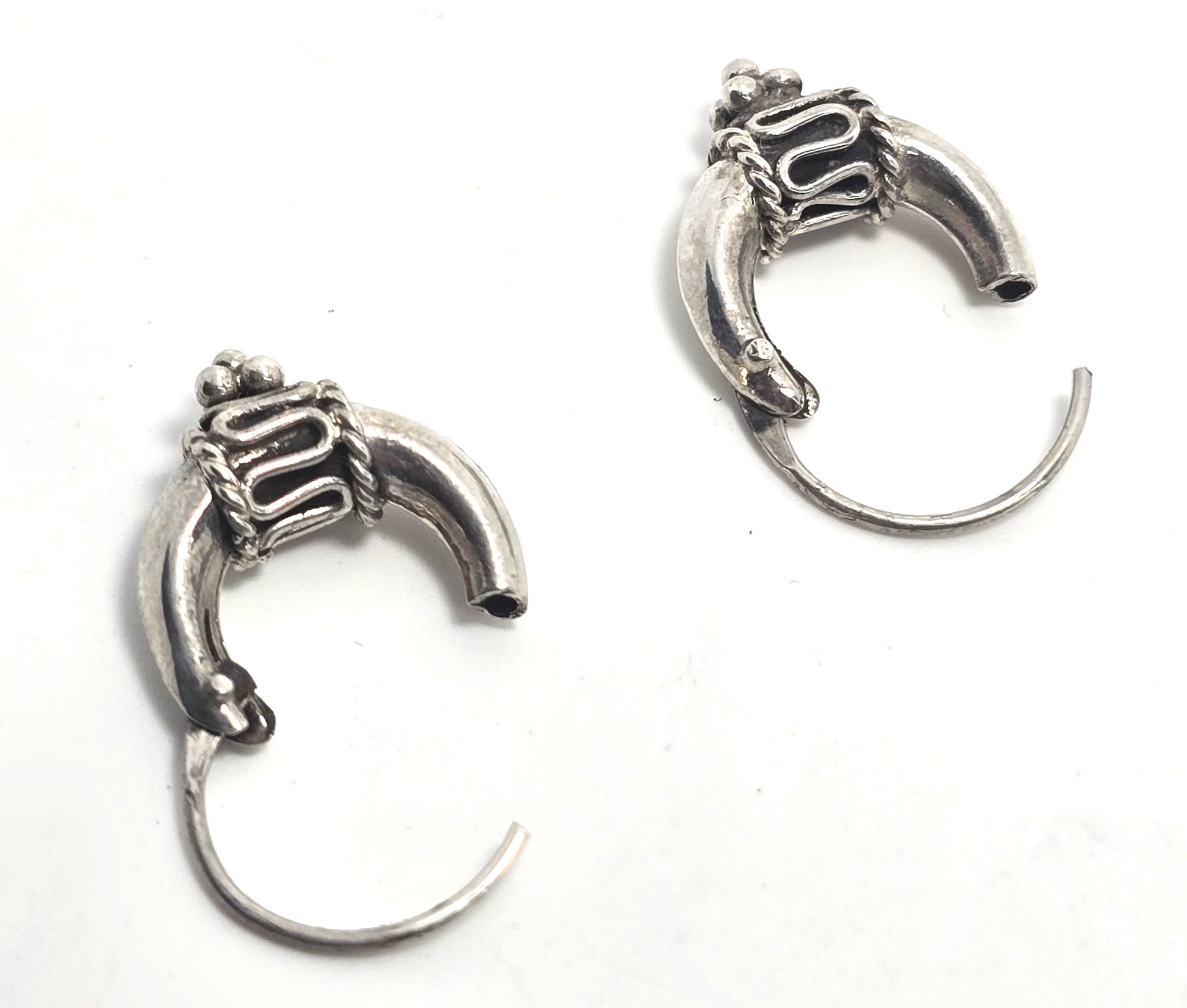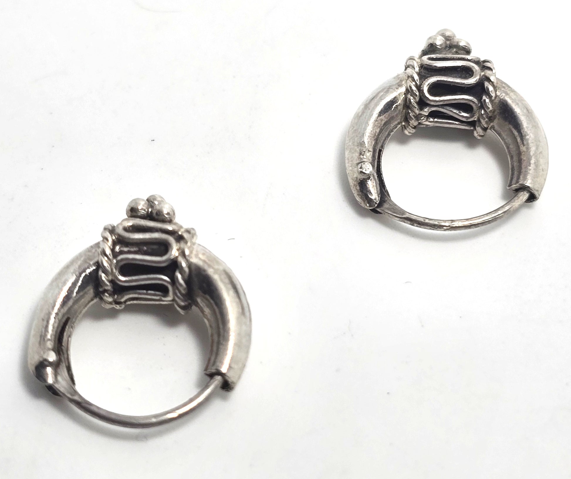 Retro Tribal Bali puffy internal threaded sterling silver small hoop earrings. Good used condition with little signs of normal wear. Great patina present. These hoops have a threader fastening that feeds into the tube for a secure fit. Stamped 925 on the threader.