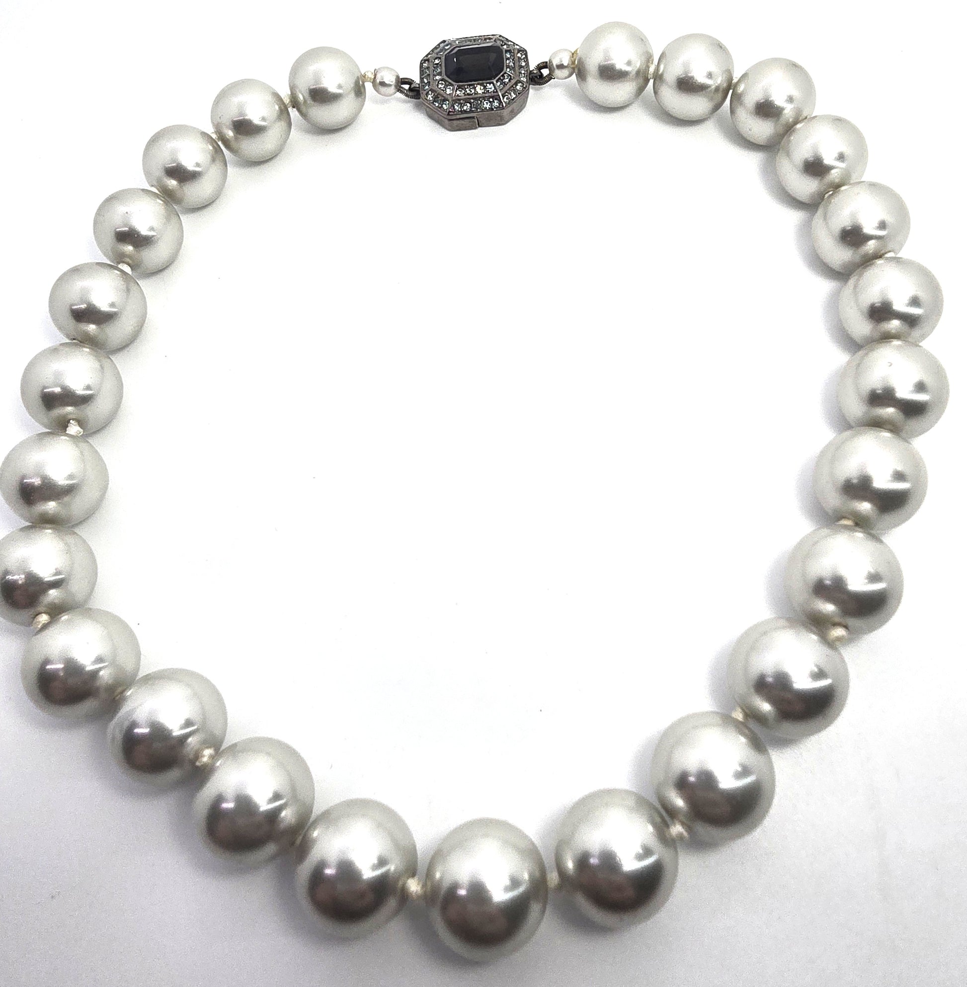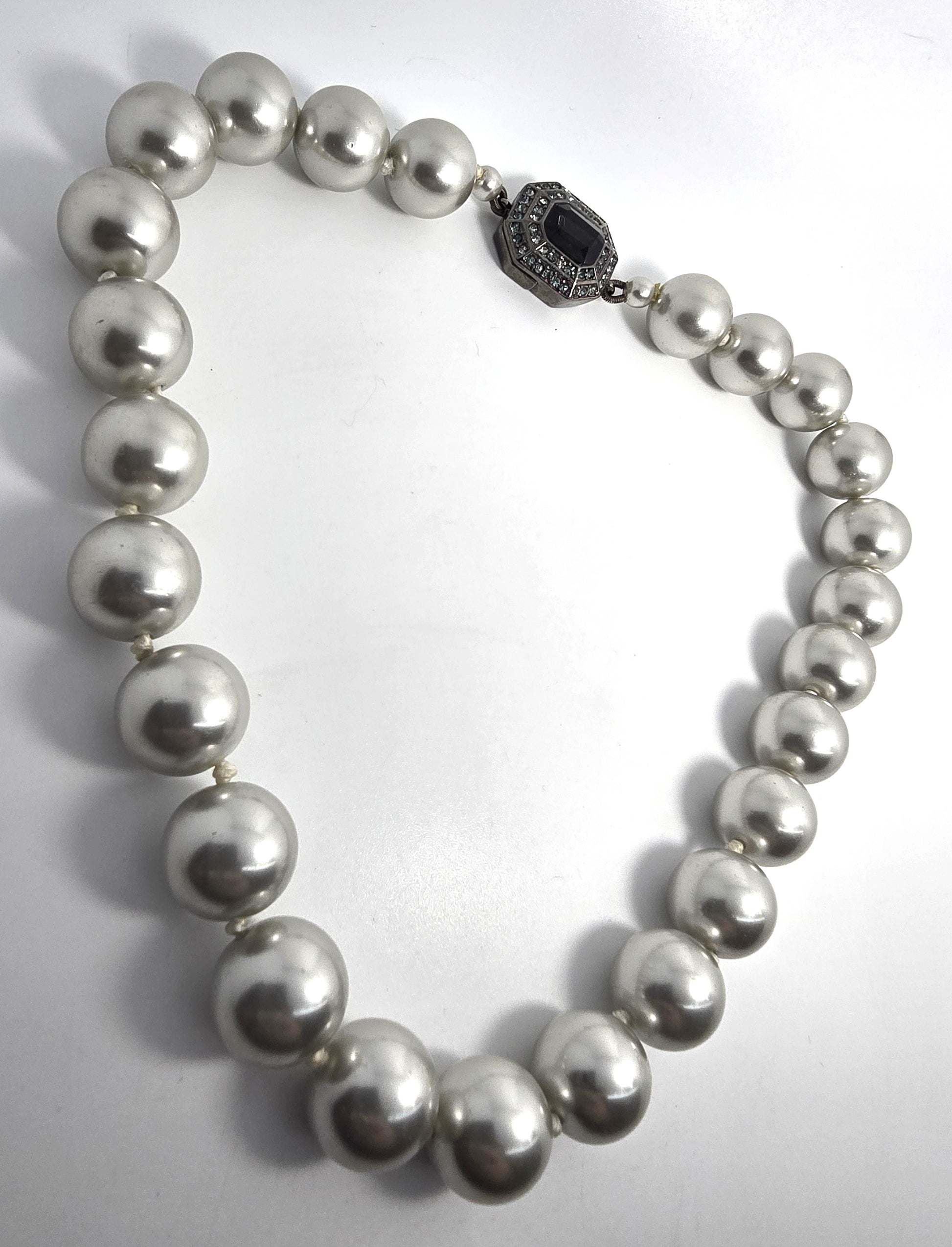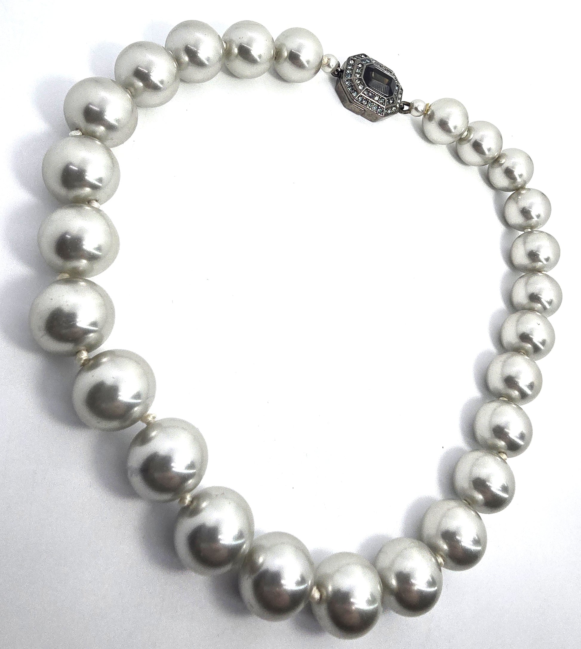 Carolee large cultured silver white large cultured pearl rhinestone necklace Good vintage condition with little to no signs of normal vintage wear. Clasp is magnetic with rhinestone accents. No missing or black stones. Strung on silk with knots between each one.