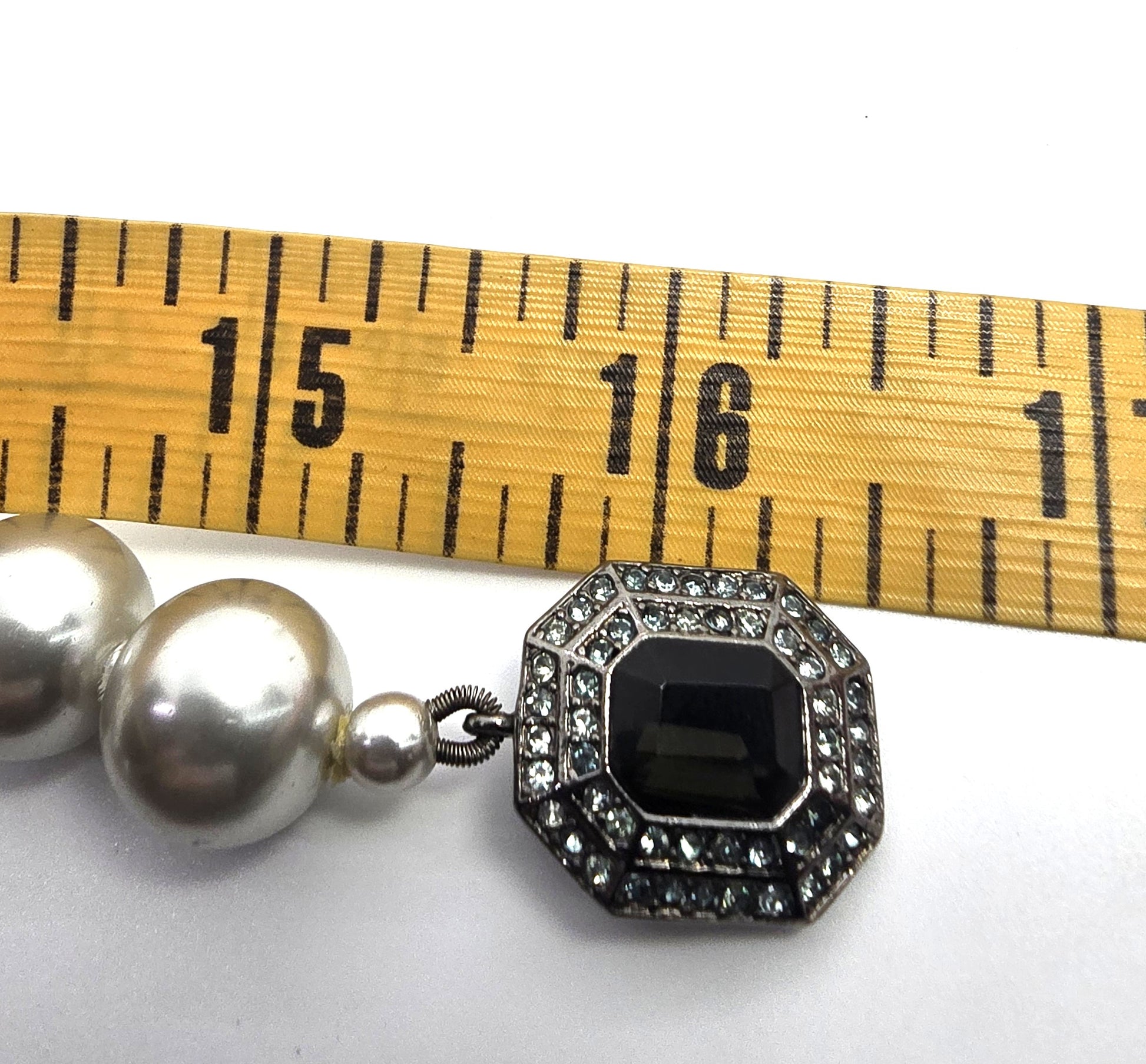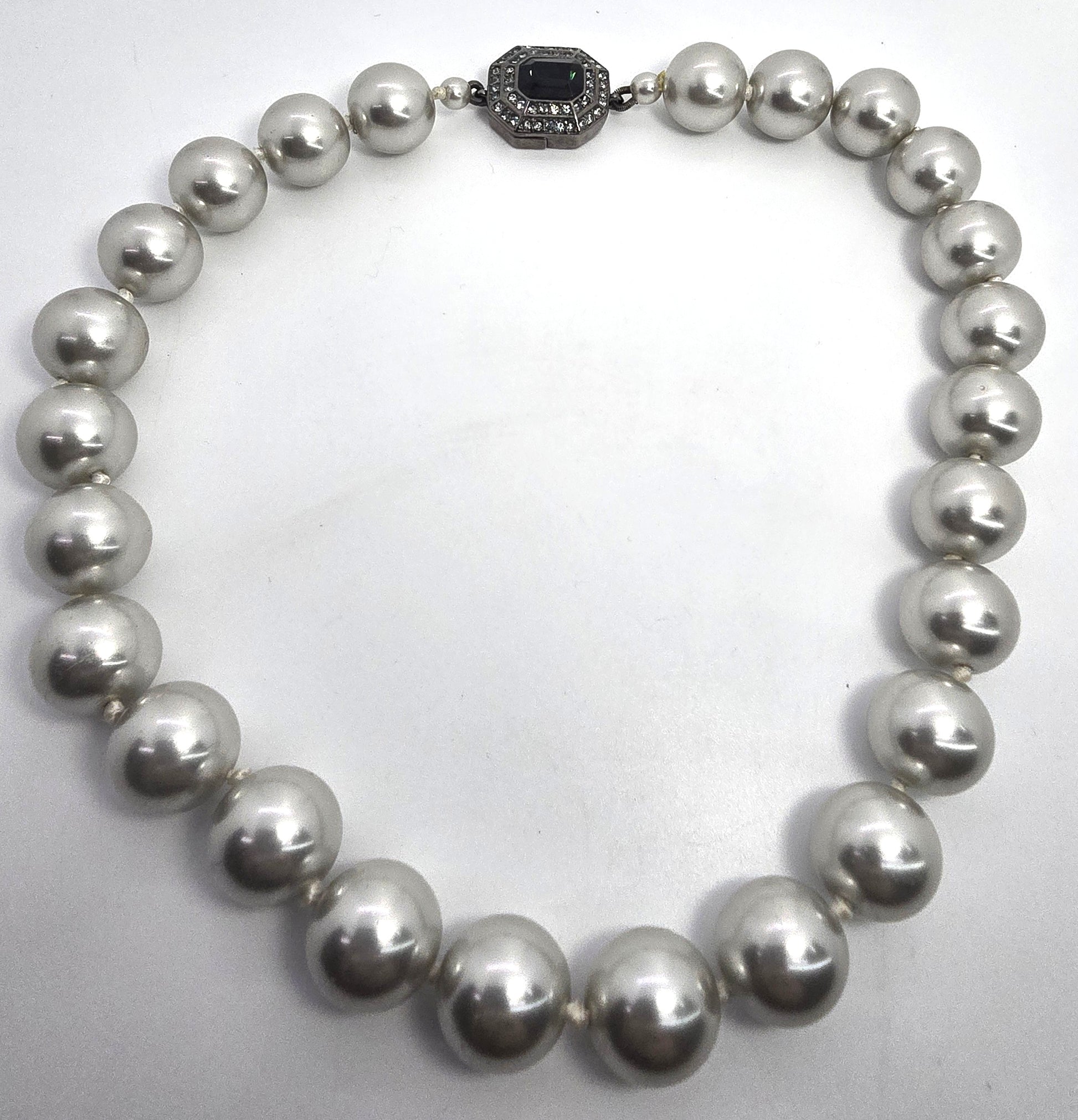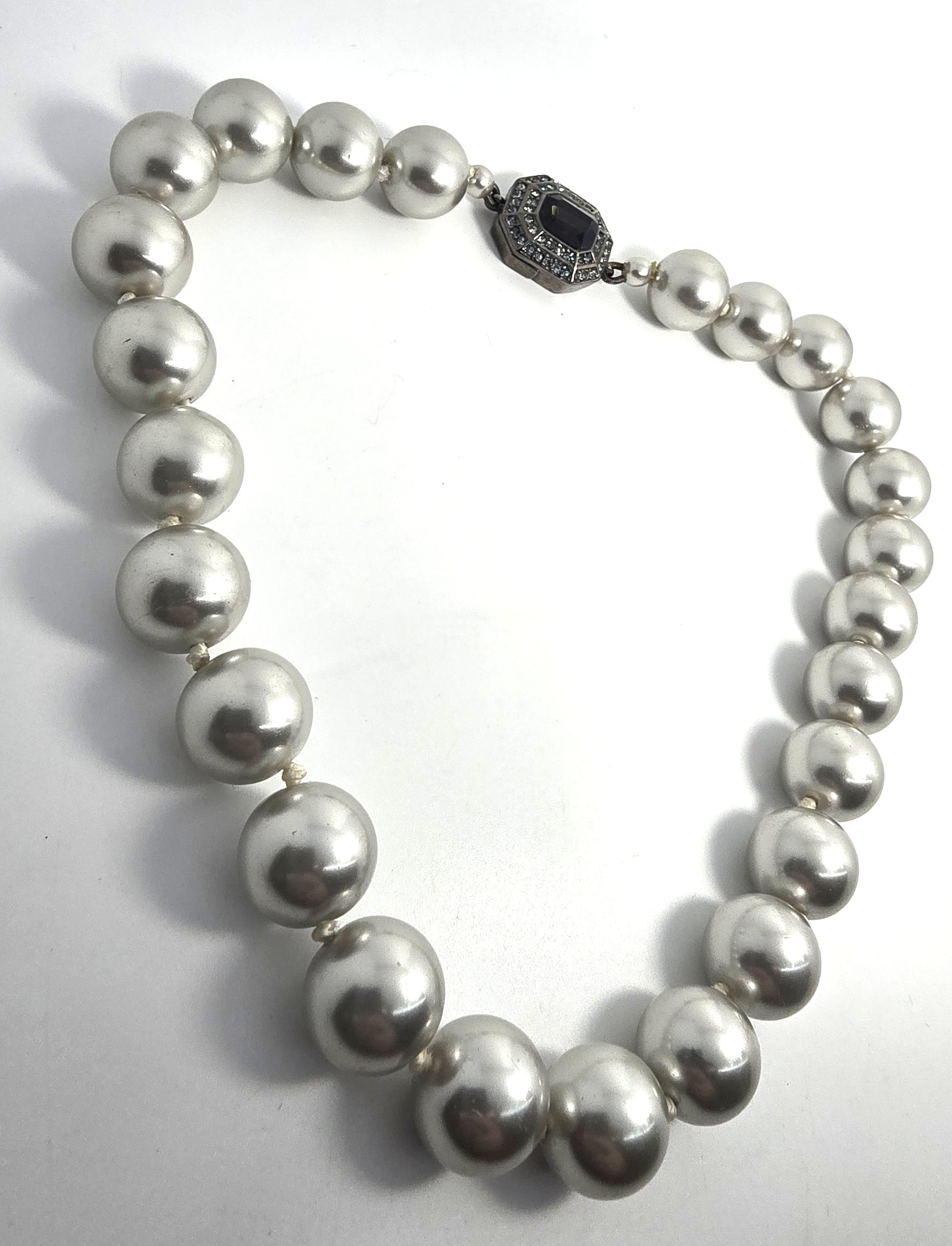 Carolee large cultured silver white large cultured pearl rhinestone necklace Good vintage condition with little to no signs of normal vintage wear. Clasp is magnetic with rhinestone accents. No missing or black stones. Strung on silk with knots between each one.
