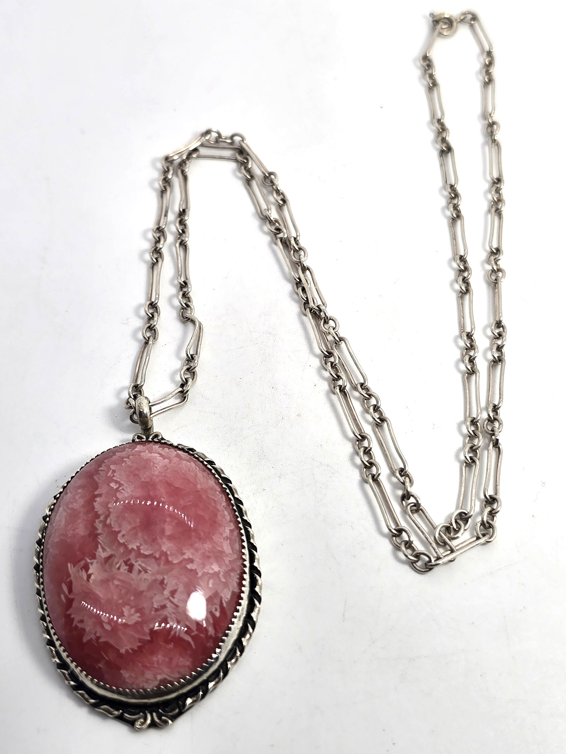 Rhodochrosite Large pink gemstone vintage handcrafted sterling silver necklace Lovely hand crafted sterling silver necklace. Good used condition with little signs of normal wear. Comes with artisan link chain. Beautiful large piece.