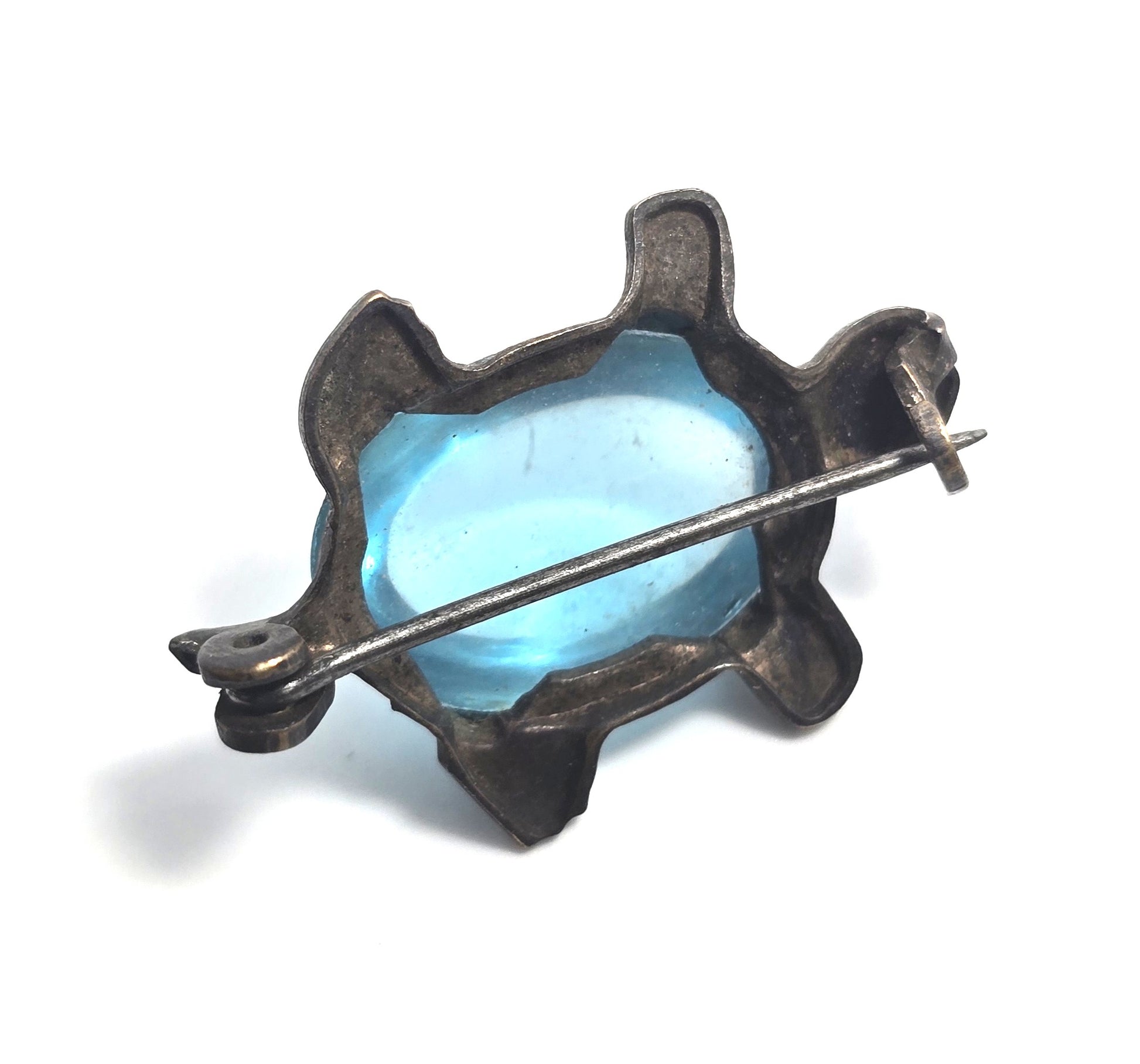 Jelly Belly aqua blue Lucite vintage small turtle figural brooch. Good vintage condition with small signs of normal vintage wear. No missing stones. C clasp fastening.