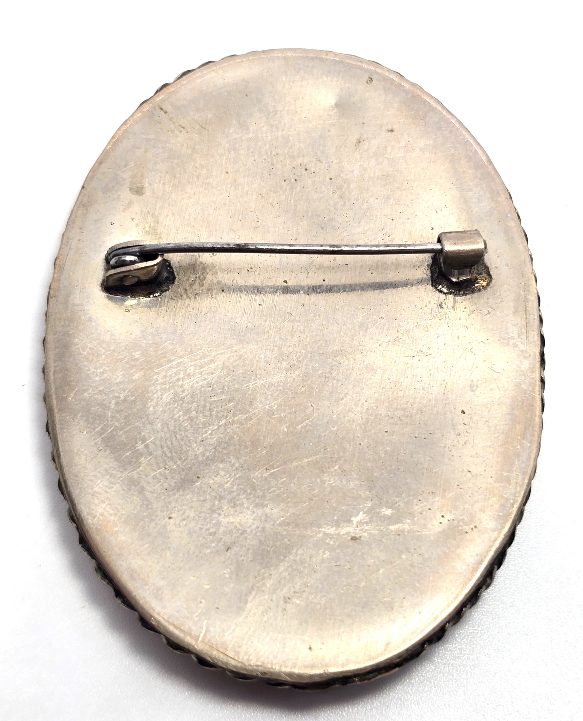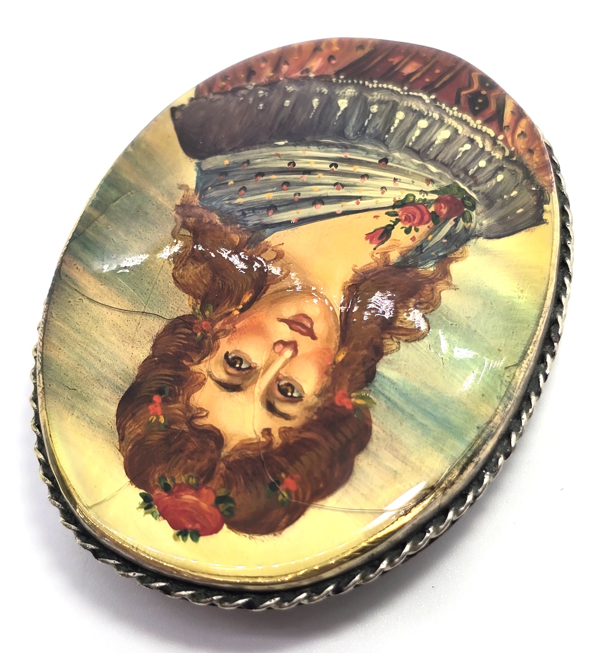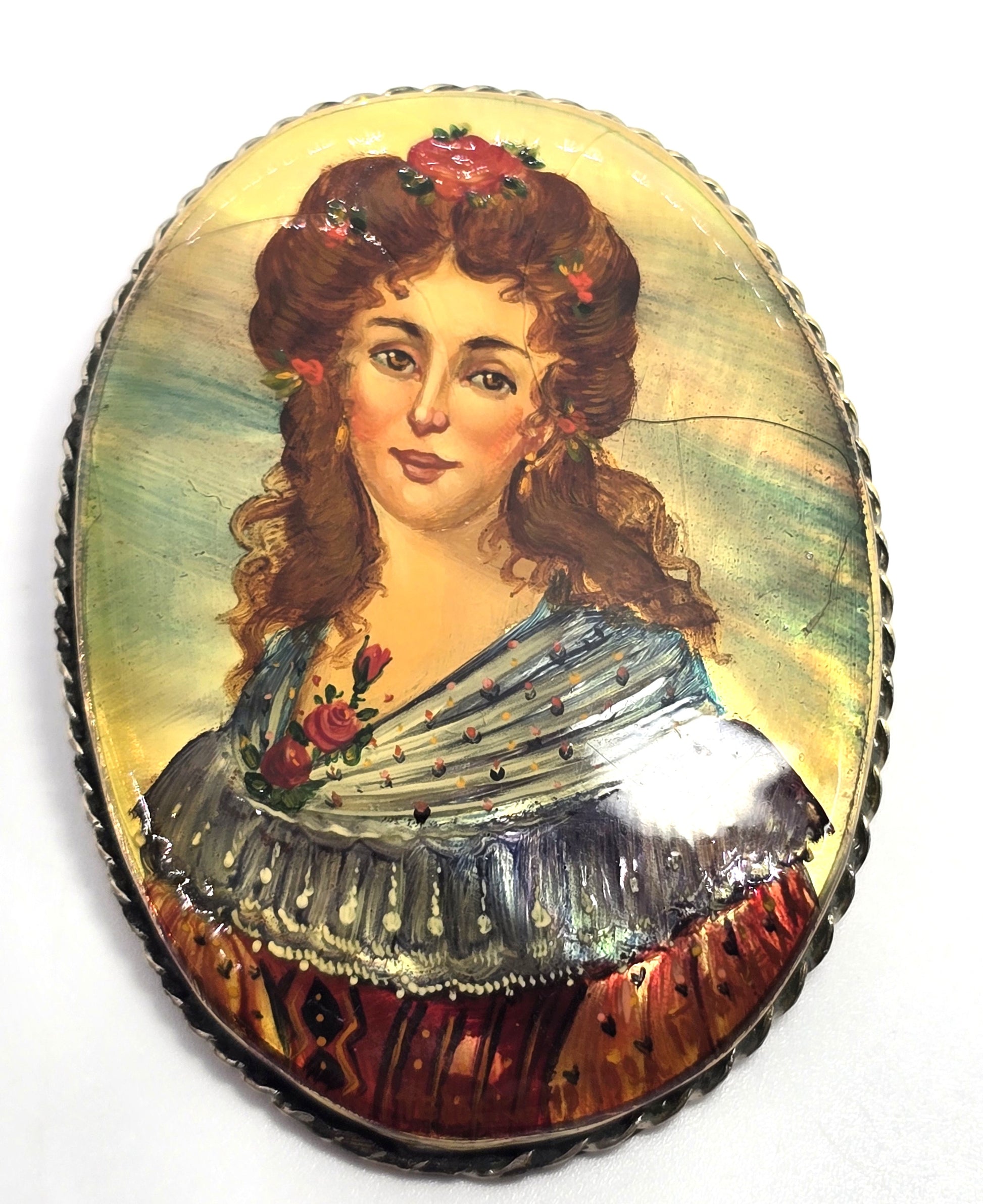 Russian hand painted women in red on Mother of pearl shell vintage brooch Good vintage condition with little signs of normal vintage wear. Silver toned vintage frame with twisted rope halo. Vintage C clasp fastening. There are a few lines of crazing in the lacquer overlay.