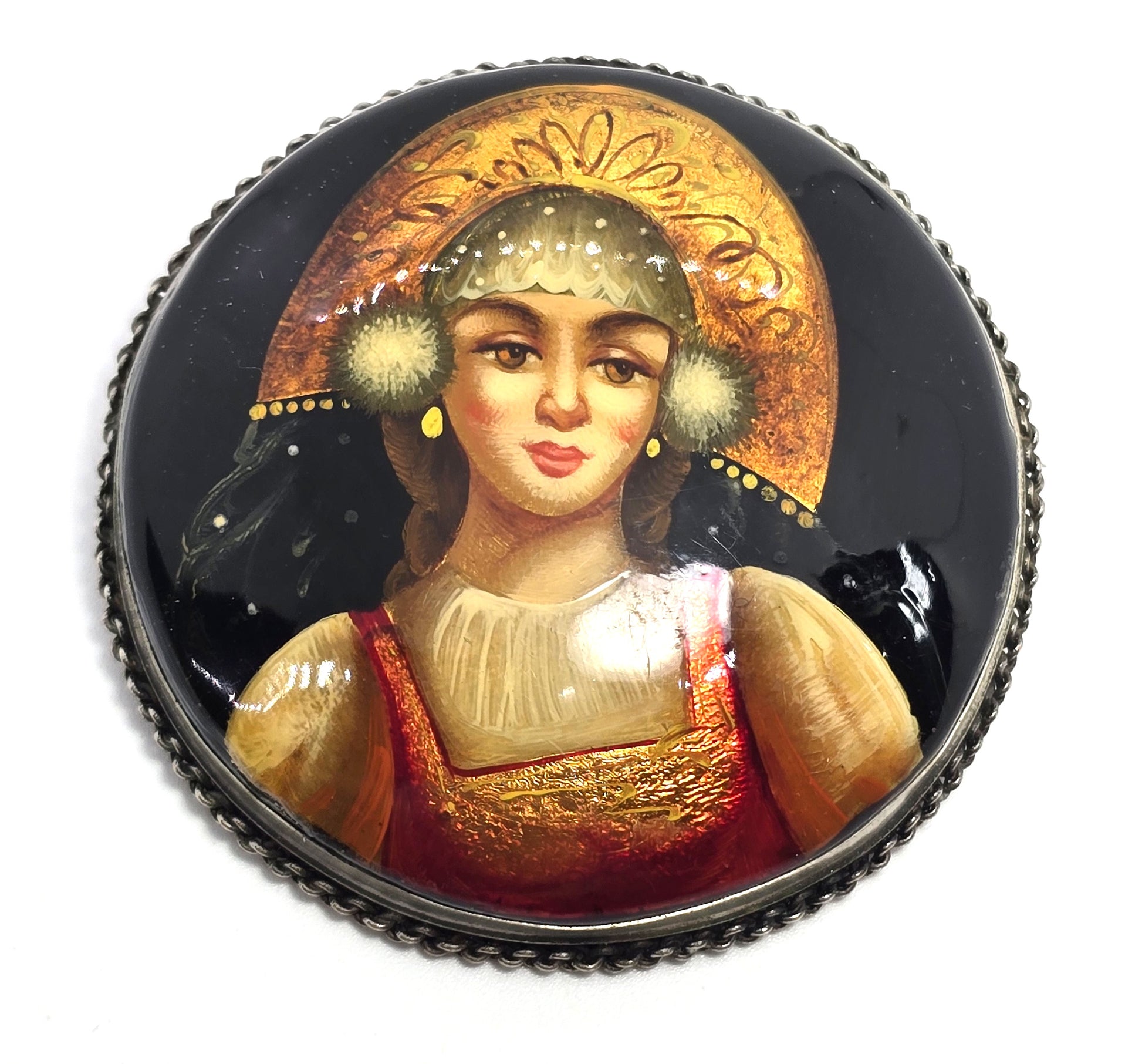 Russian hand painted Woman Kokoshnik gold leaf vintage round brooch Good vintage condition with little signs of normal vintage wear. Set in silver toned setting with chain halo. C clasp fastening.