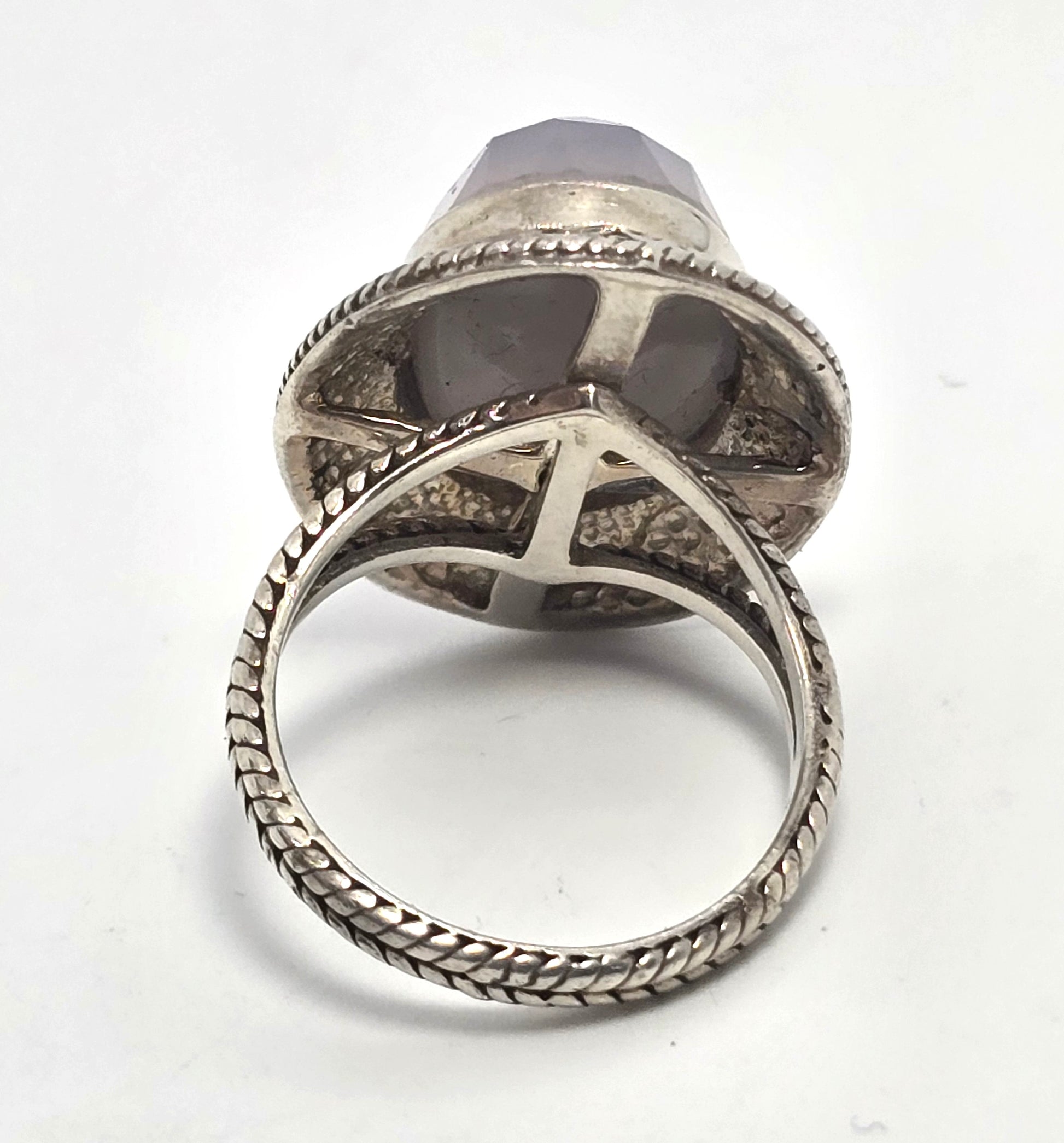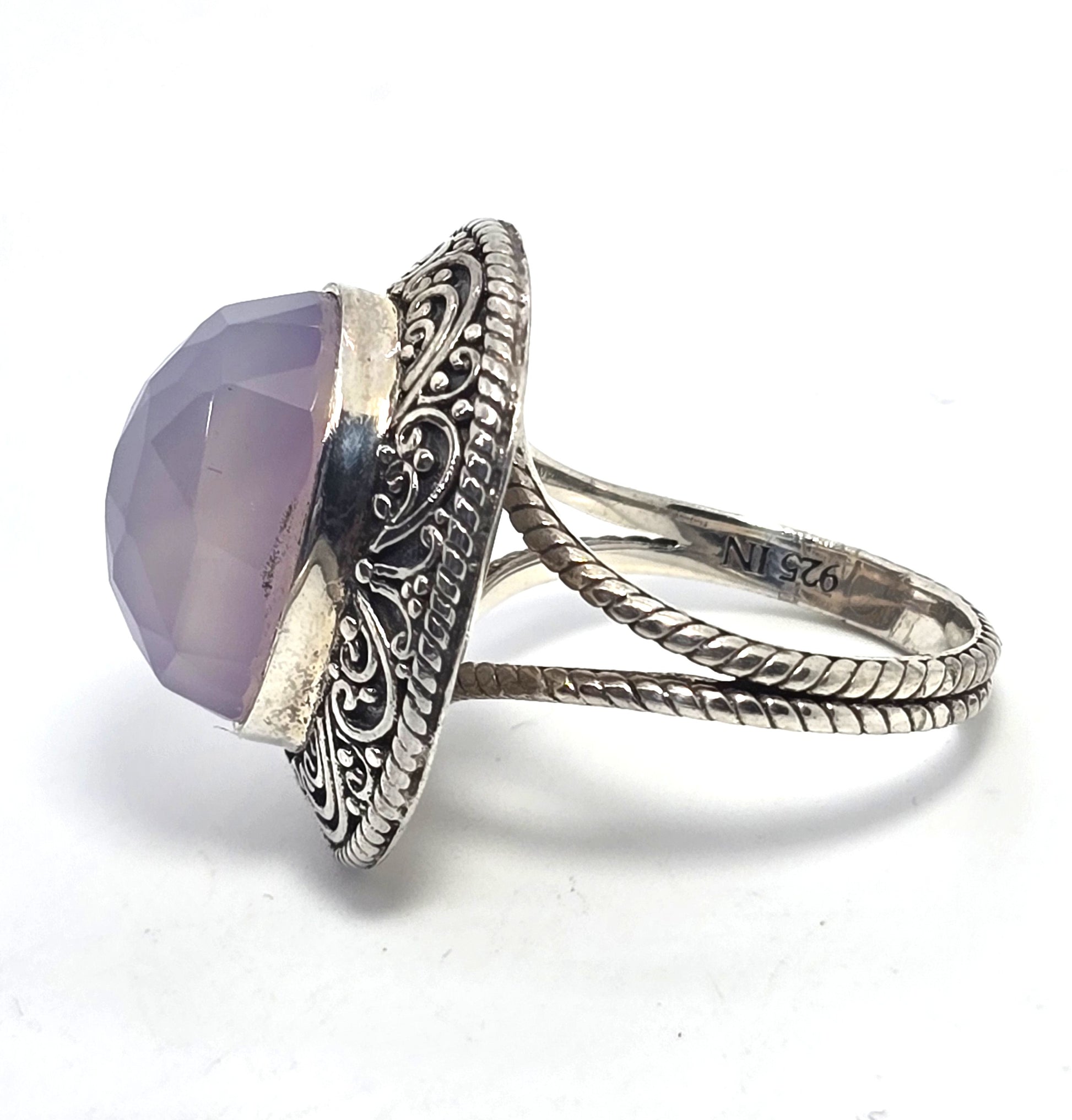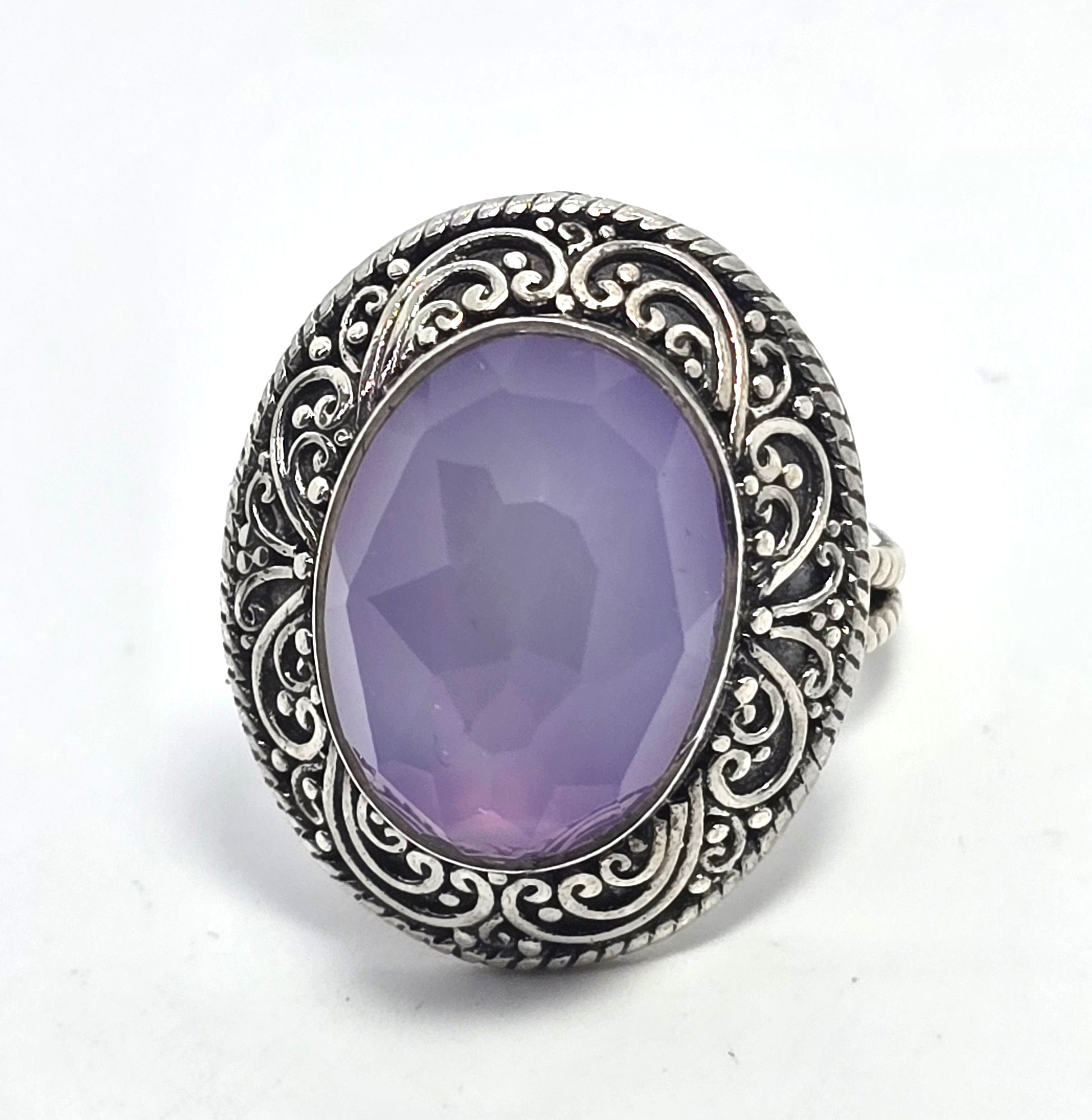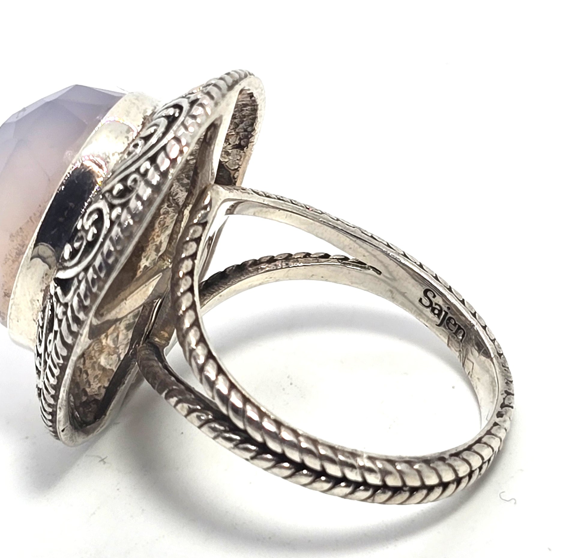 Sajen IN Blue Purple Chalcedony faceted domed Balinese large vintage ring size 8. Good used condition with little to no signs of wear. This is one of the older Sajen designs made in India before they moved their production. Solid sterling silver with bezel set large domed faceted Chalcedony. Color appears to dance in the stone.
