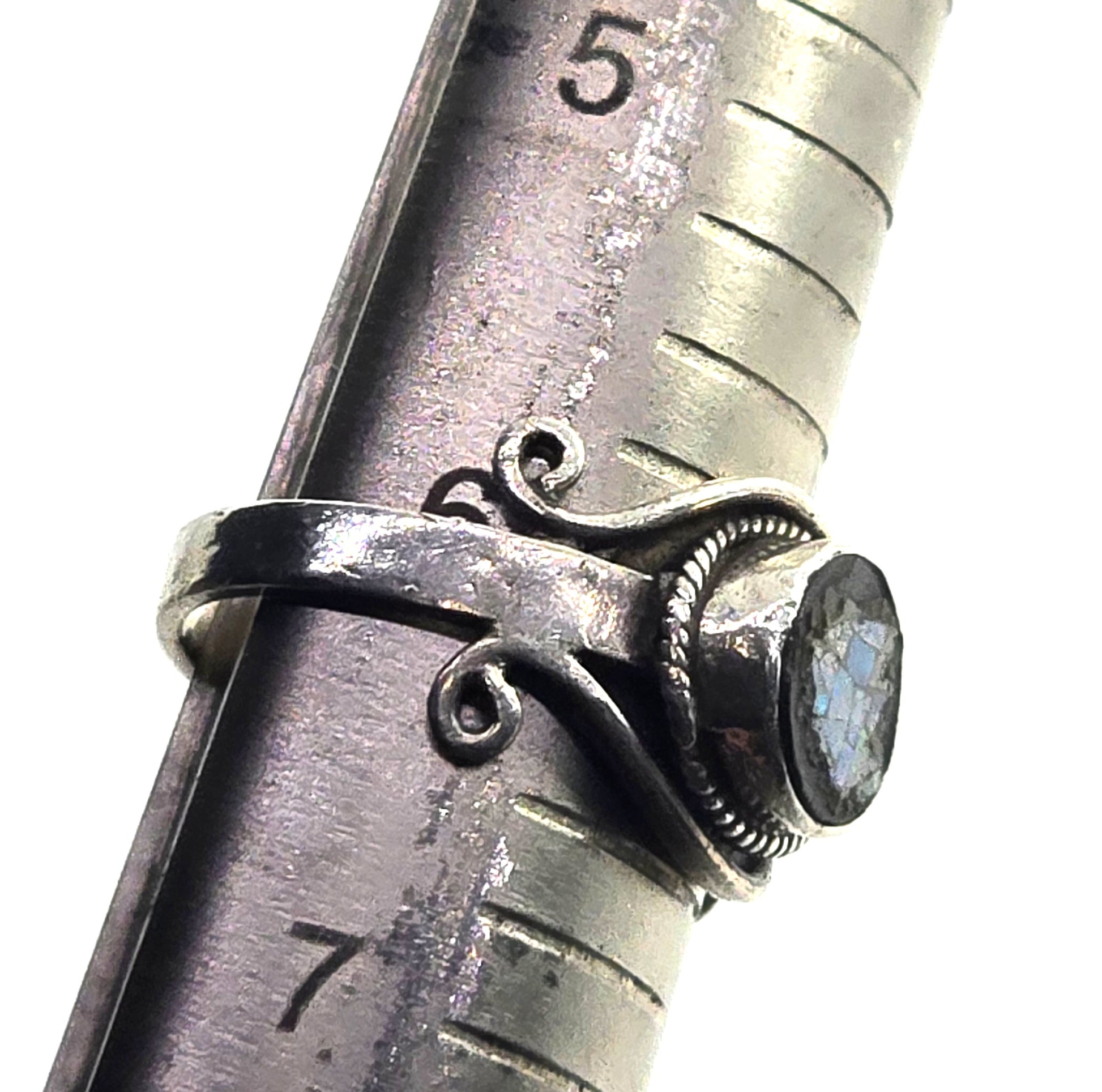 Blue fire opal black mosaic sterling silver tribal vintage ring size 6