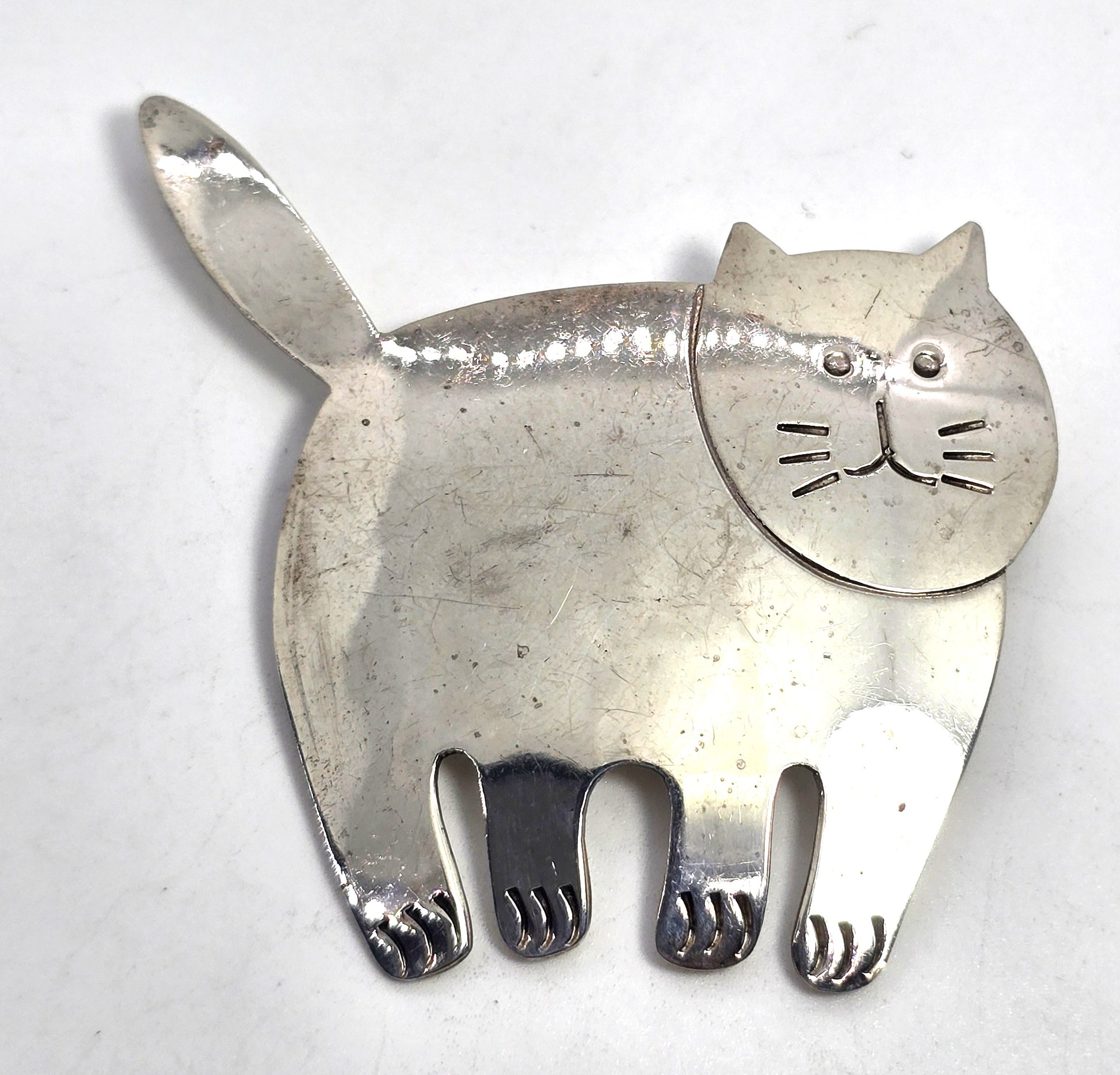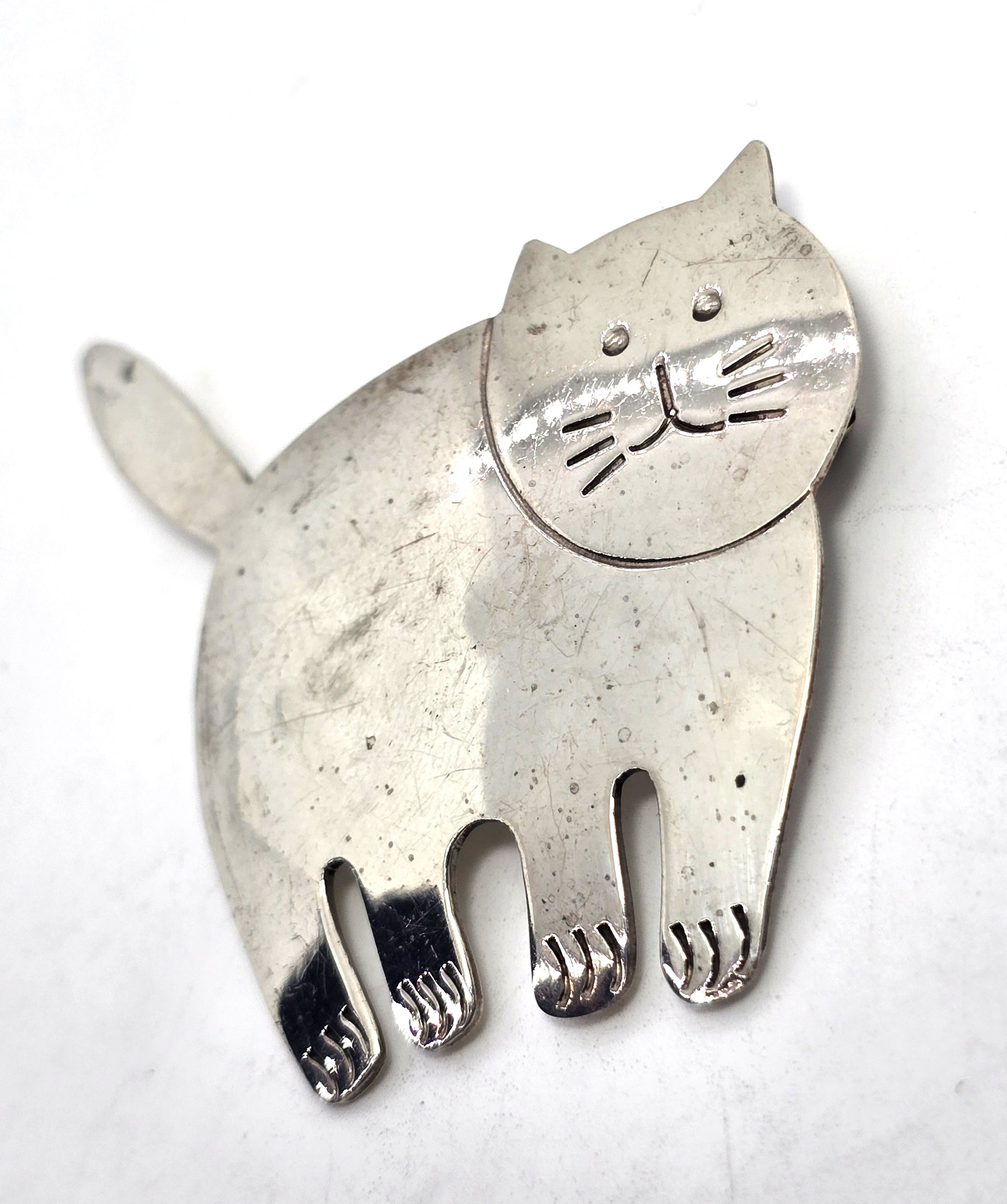 Fluffy McSnuggles King of the yard vintage sterling silver fat cat brooch. Good used condition with little signs of normal wear. Great vintage patina. Stamped Sterling 925 on the back. Solid sterling silver construction. Fluffy is ready for his new home.