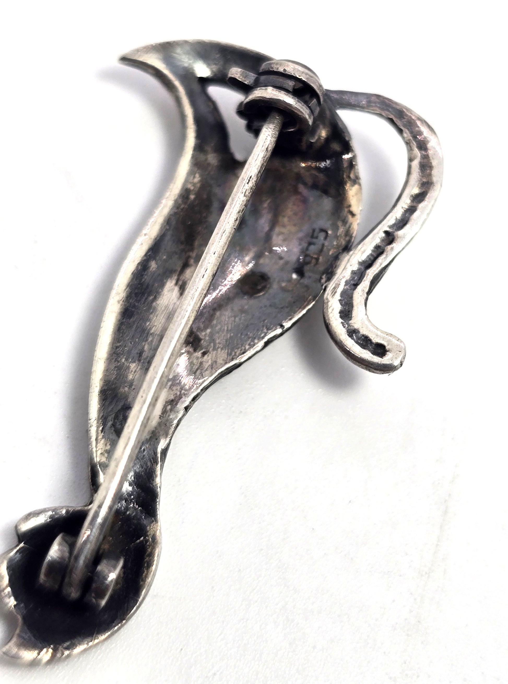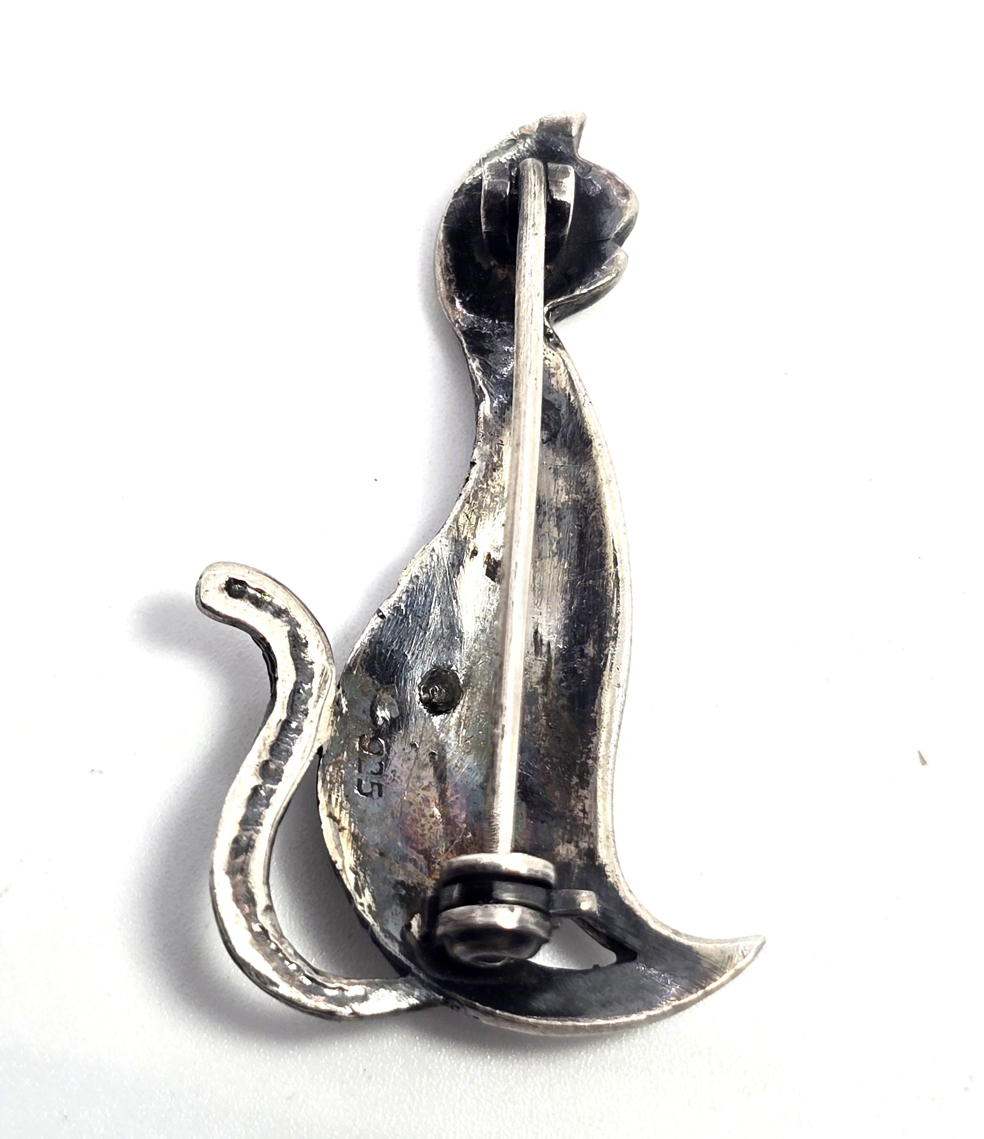 Sitting pretty cat marcasite sterling silver retro feline brooch . Good vintage condition with small signs of normal vintage wear. Stamped 925 on the back of the brooch. No missing stones.