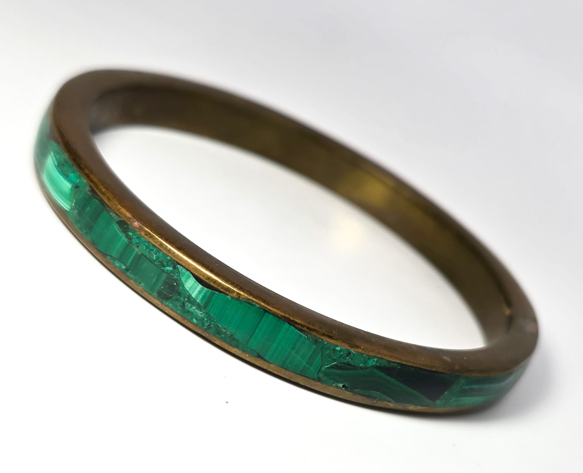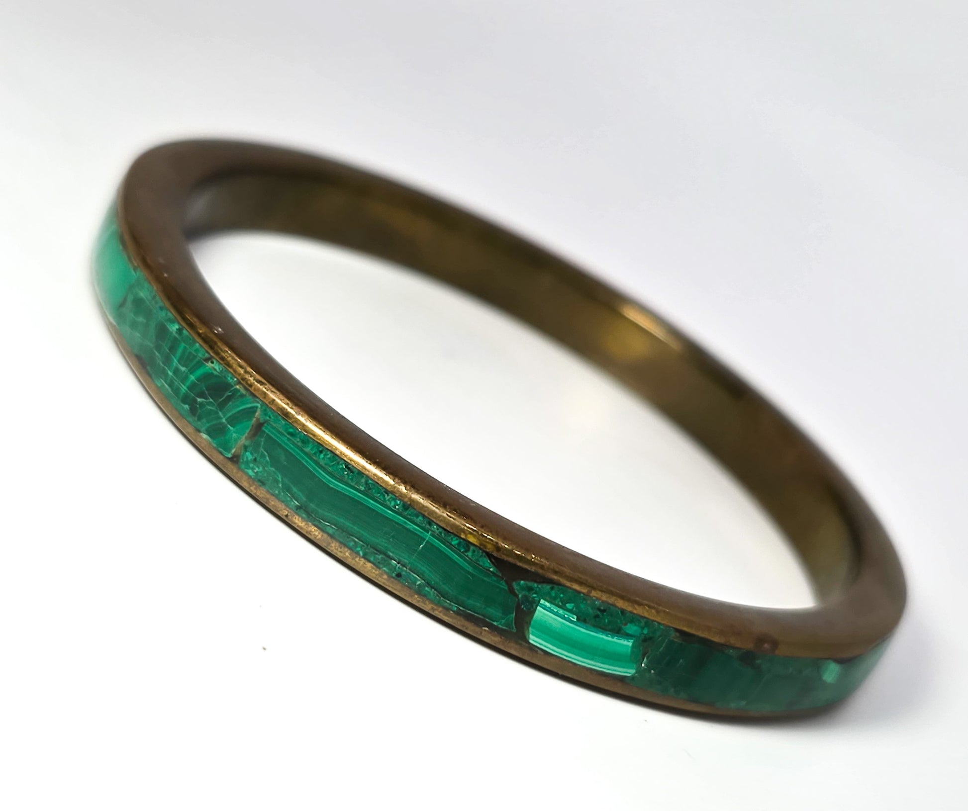 Malachite chip inlay green gemstone vintage brass bangle bracelet. Good used condition with little signs of normal wear. Brass shows some spotting and small signs of normal wear. Great patina. Bracelet has been left in original found condition. Thick solid construction.