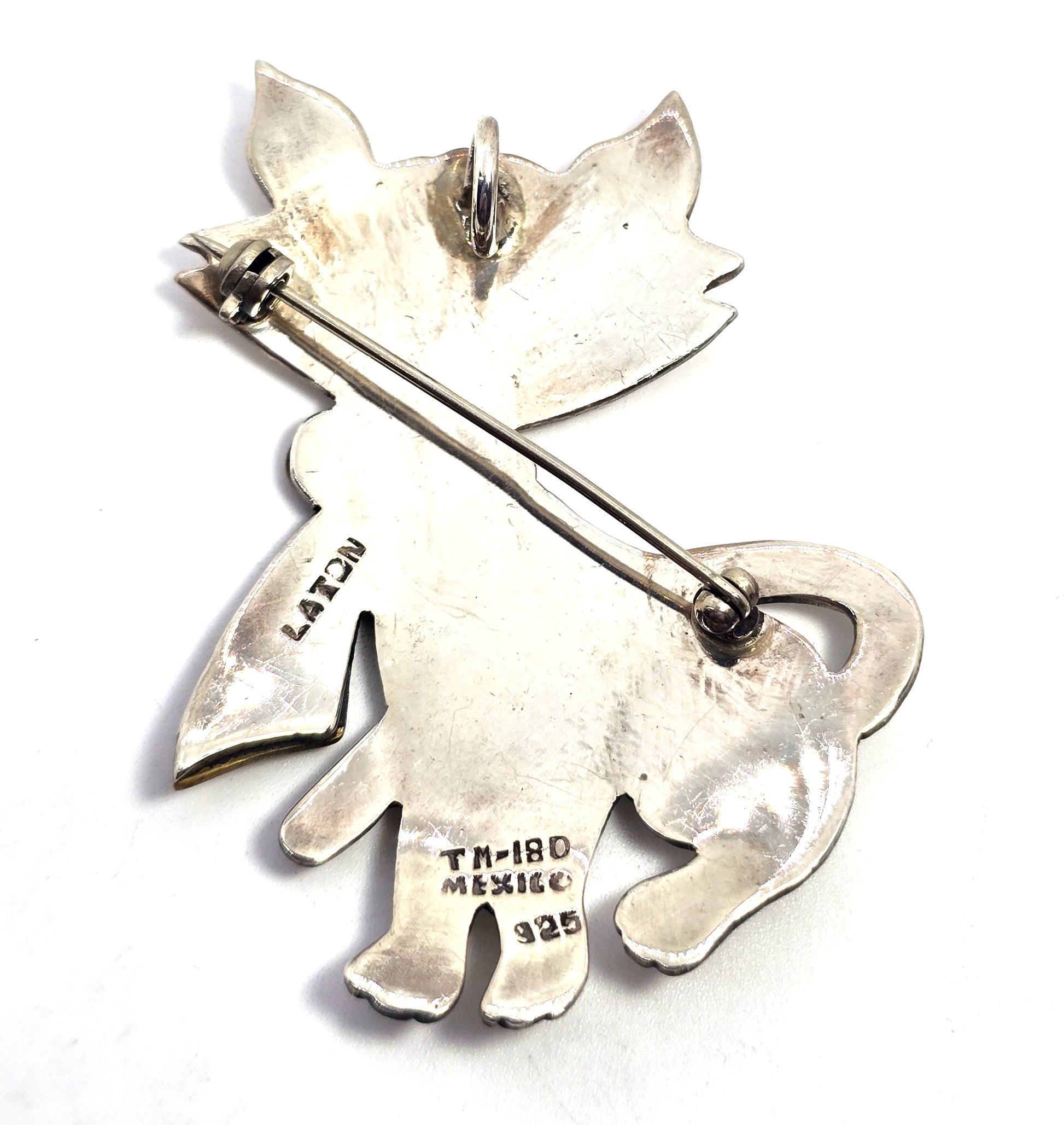 Laton Taxco Mexican Kitty Cat Large vintage brass bow sterling silver pendant brooch. Good used condition with little signs of normal wear. Great vintage patina. Stamped TR-180 Mexico 925 Laton. Solid sterling silver construction. Has both pendant and brooch fastening.