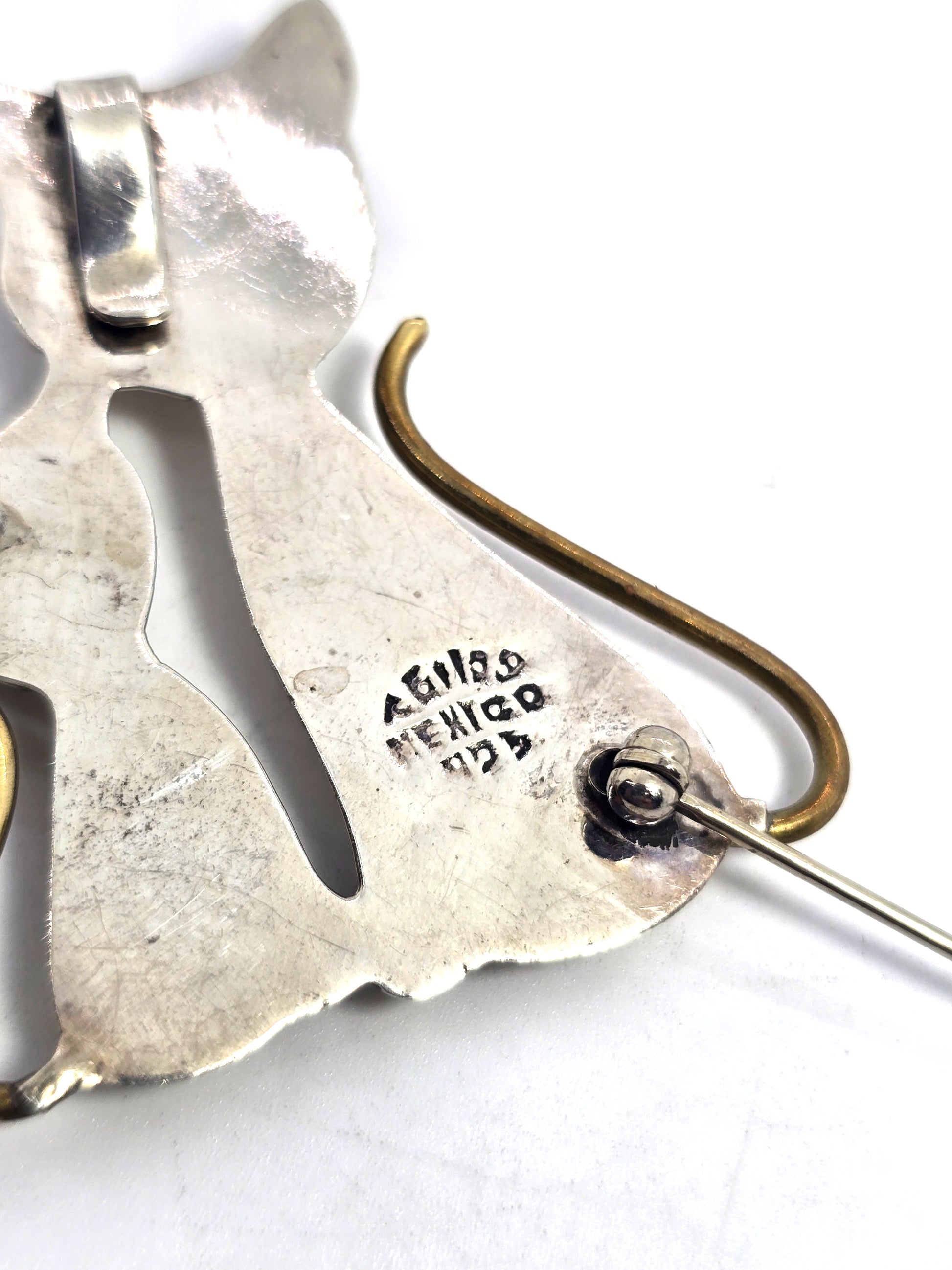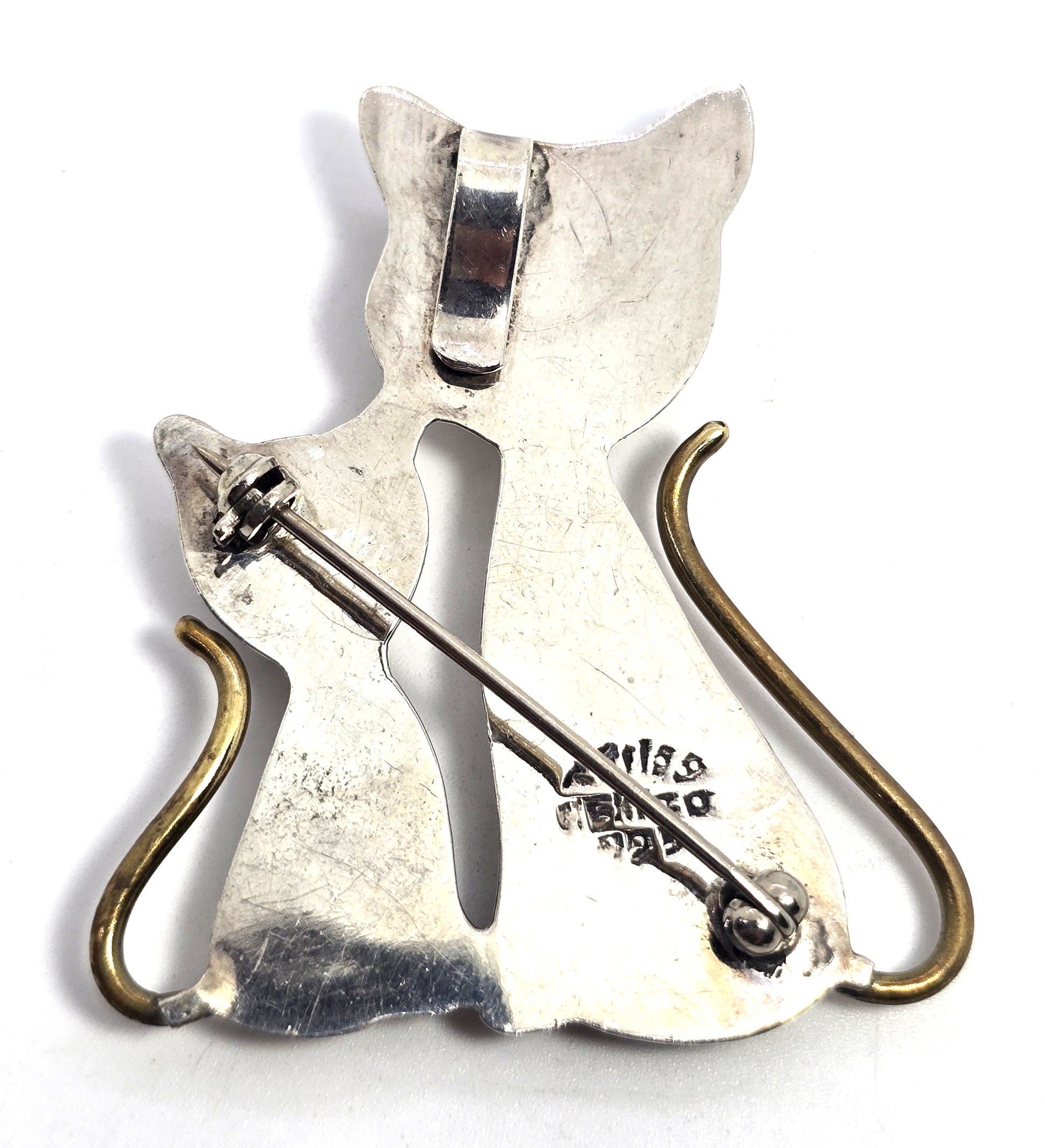 Taxco Mexican Double Kitty Cat Large vintage brass and sterling silver feline brooch . Good used condition with little signs of normal wear. Great vintage patina. Stamped Mexico 925 TD-54. Solid sterling silver construction. Has both pendant and brooch fastening.