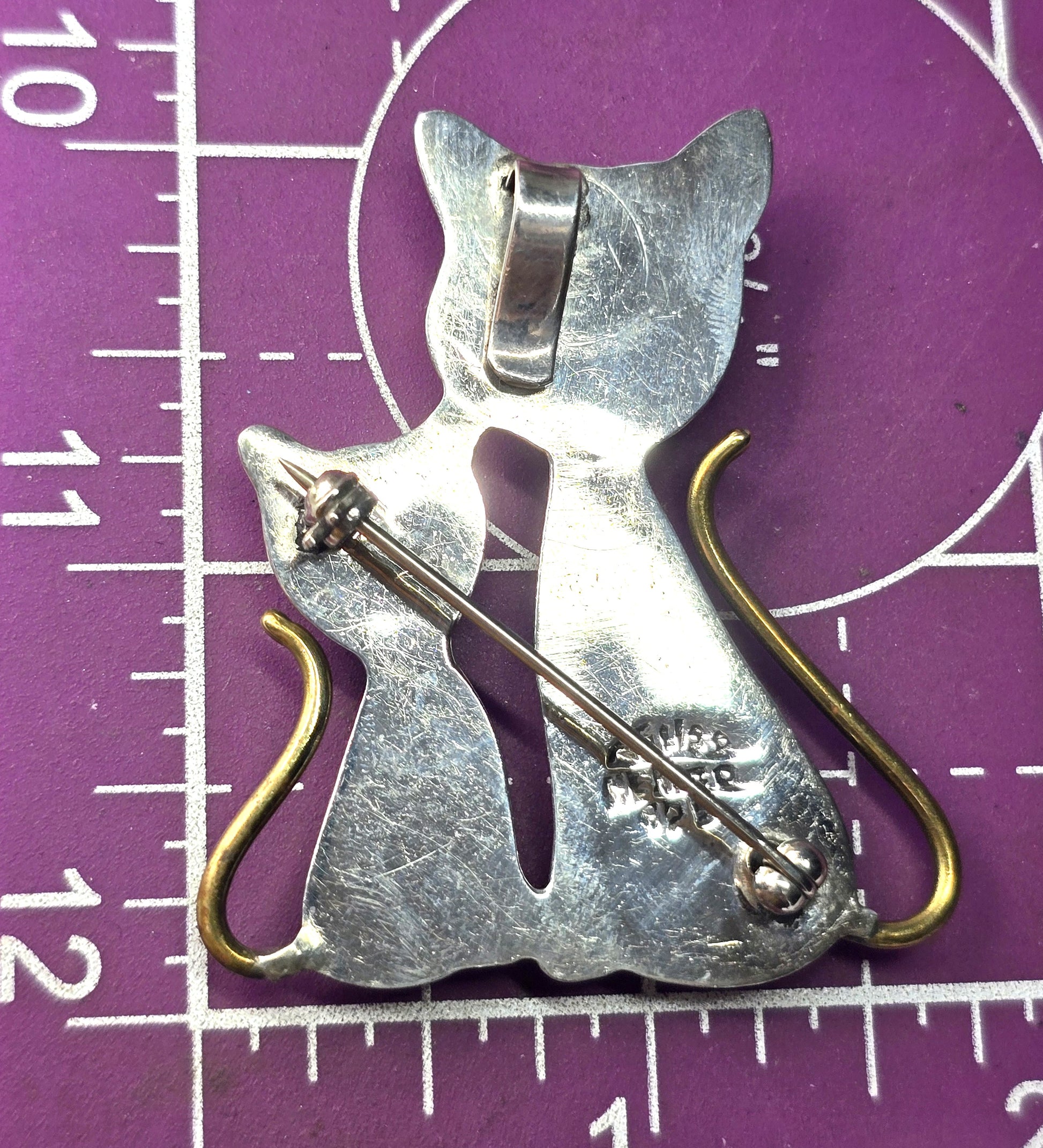 Taxco Mexican Double Kitty Cat Large vintage brass and sterling silver pendant brooch