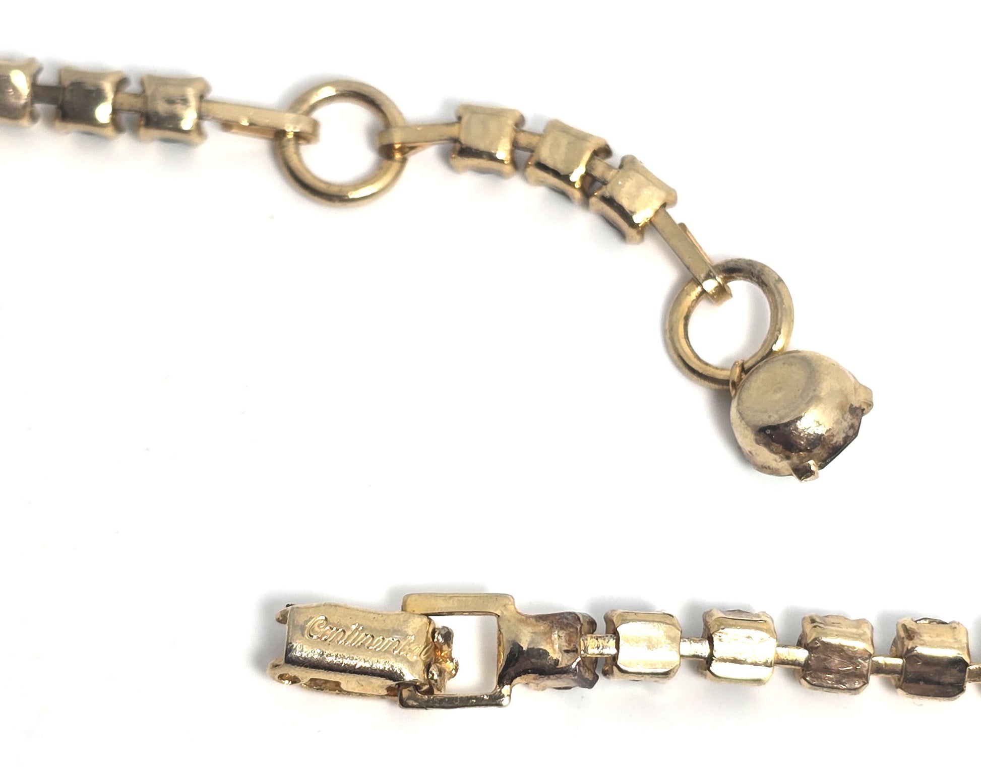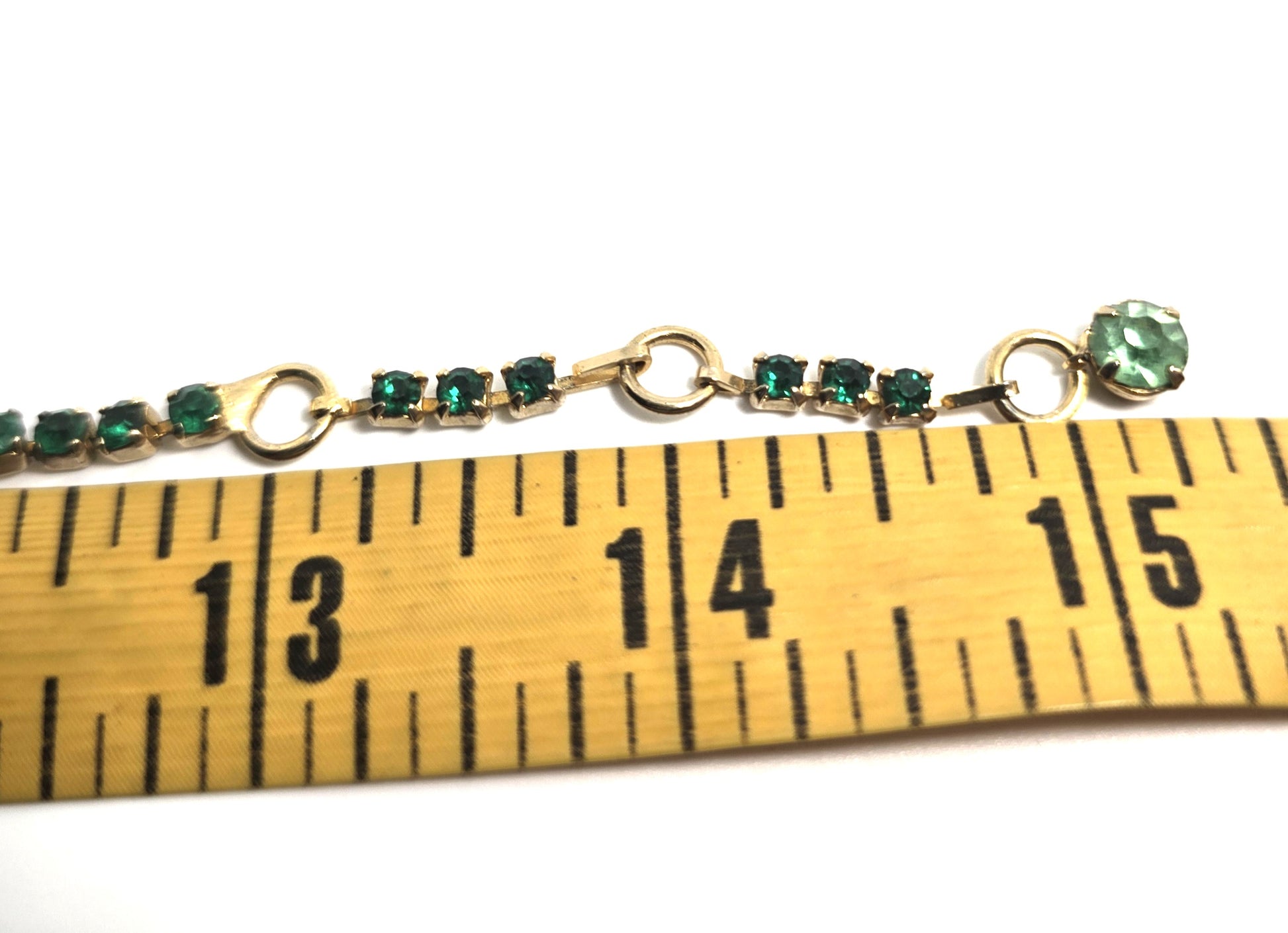 Continental Deep green and Uranium Glass rhinestone vintage m d century Necklace Beautiful faceted uranium glass rhinestones. Good vintage condition with little to no signs of normal wear.. Prong set in gold toned setting. Fold over clasp stamped Continental. Chain has three loops for length adjustment.