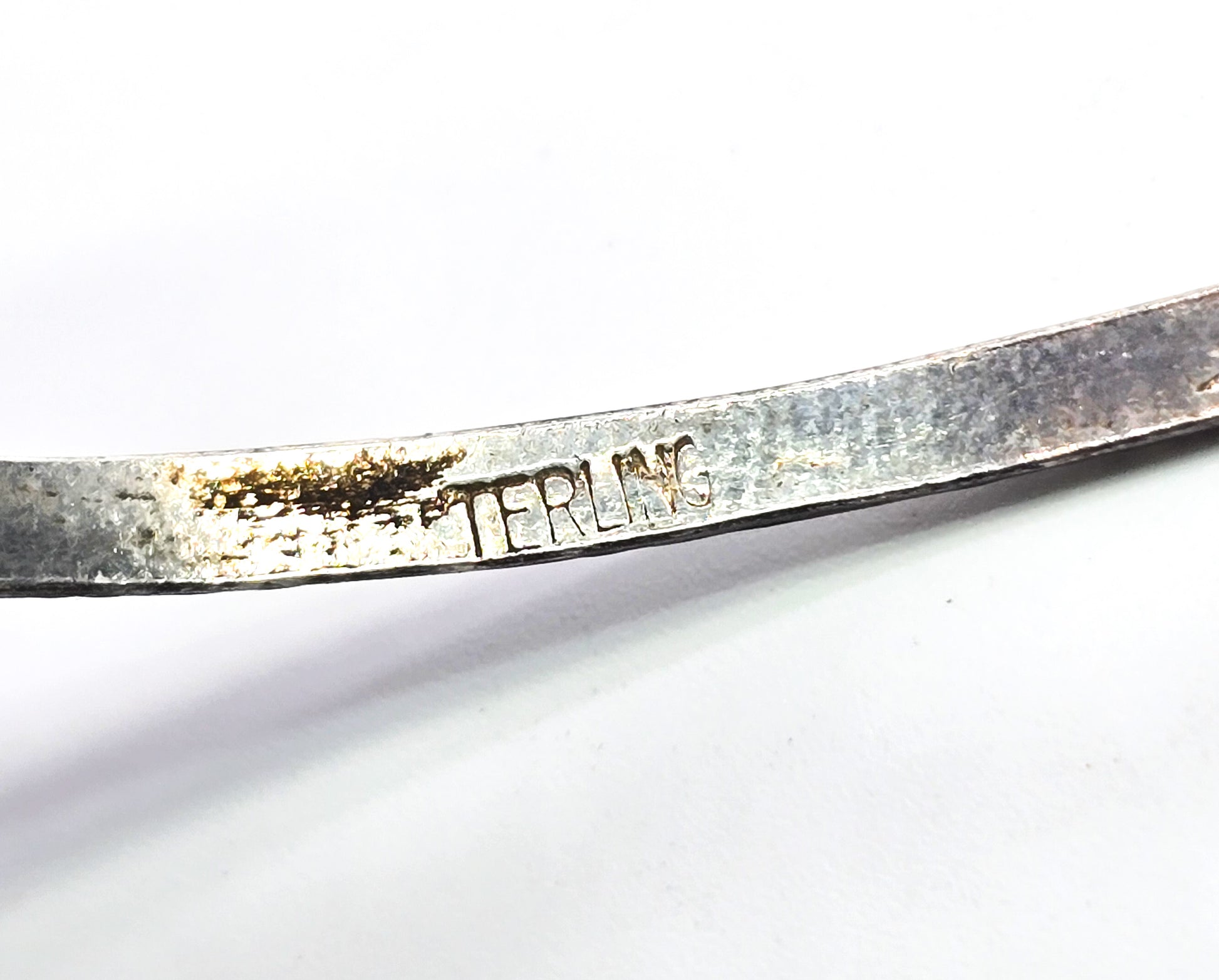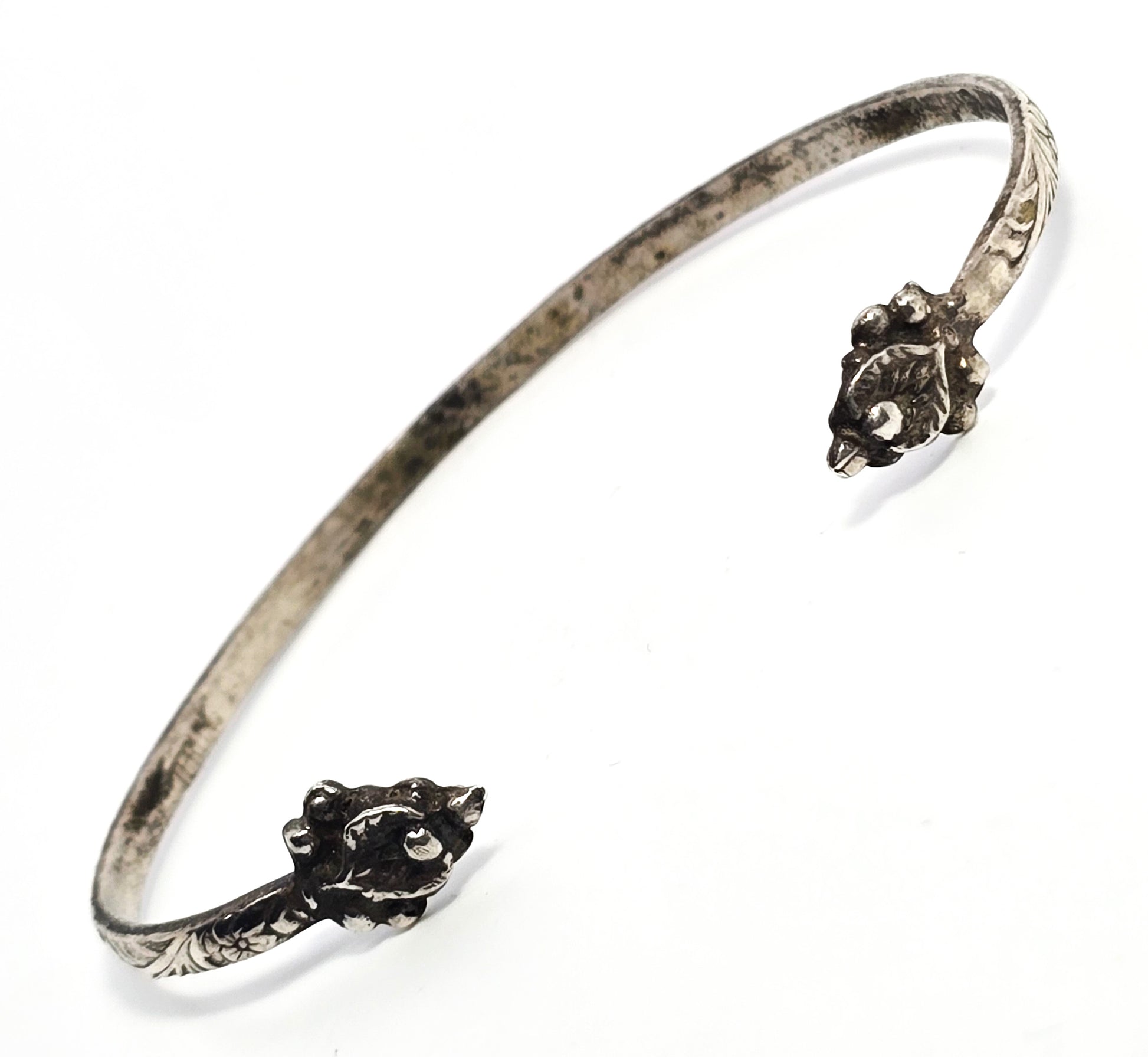 Tribal Bali vintage thin small sterling silver etched bangle. Beautiful petite bangle bracelet. Each end has a decorated point. Outside of the band has an etched tribal design. Stamped STERLING on the inside of the band.
