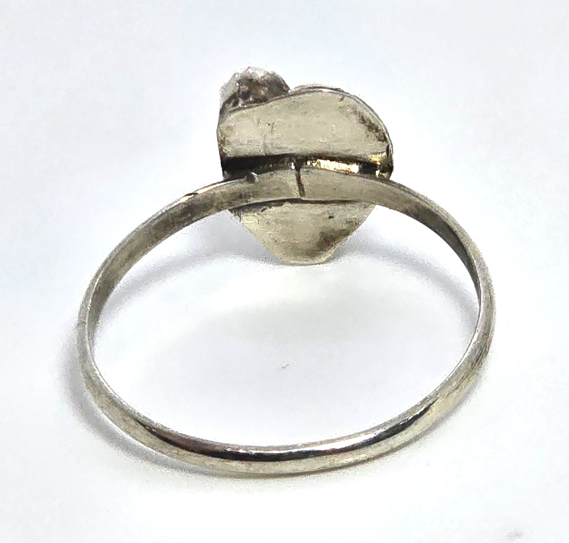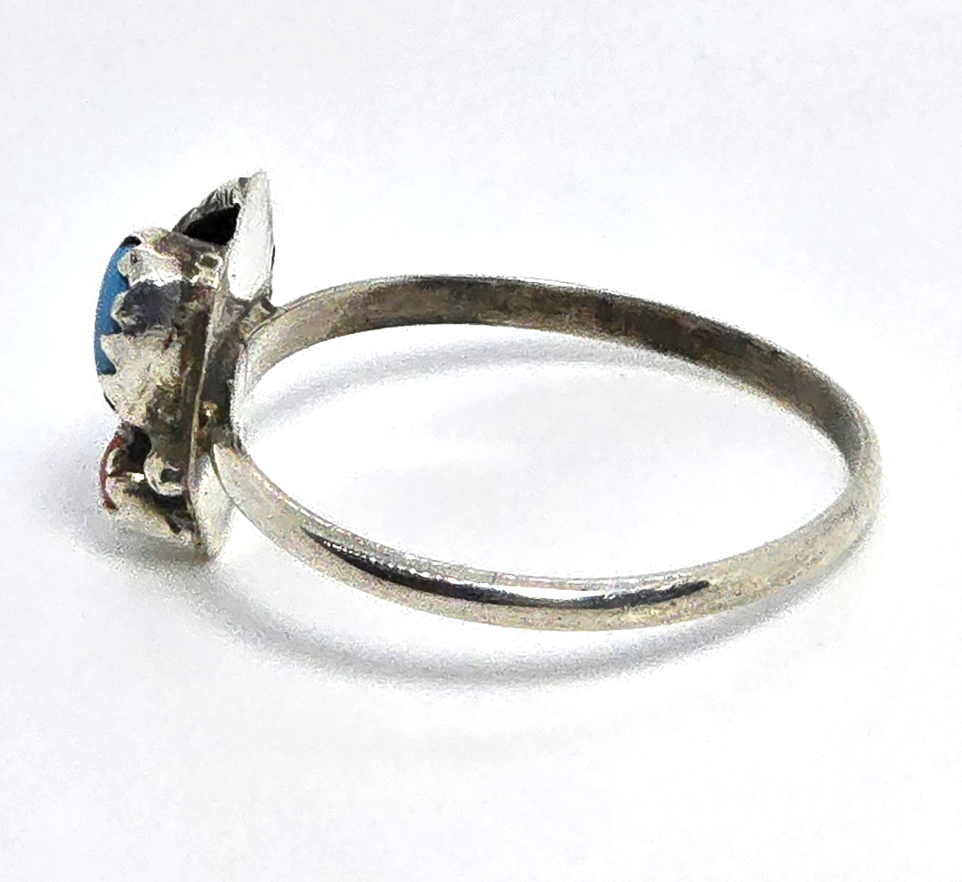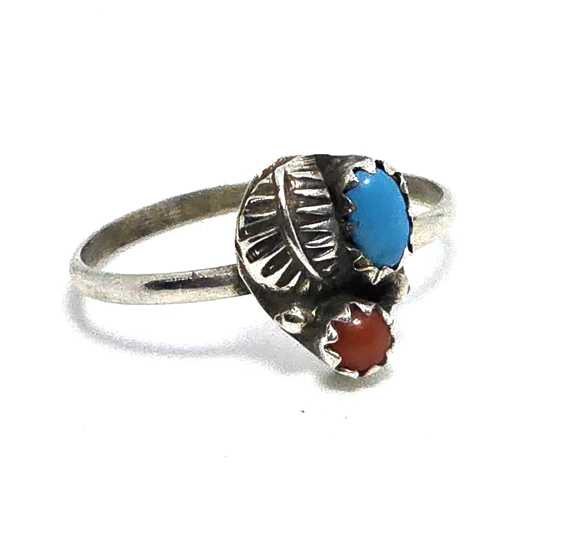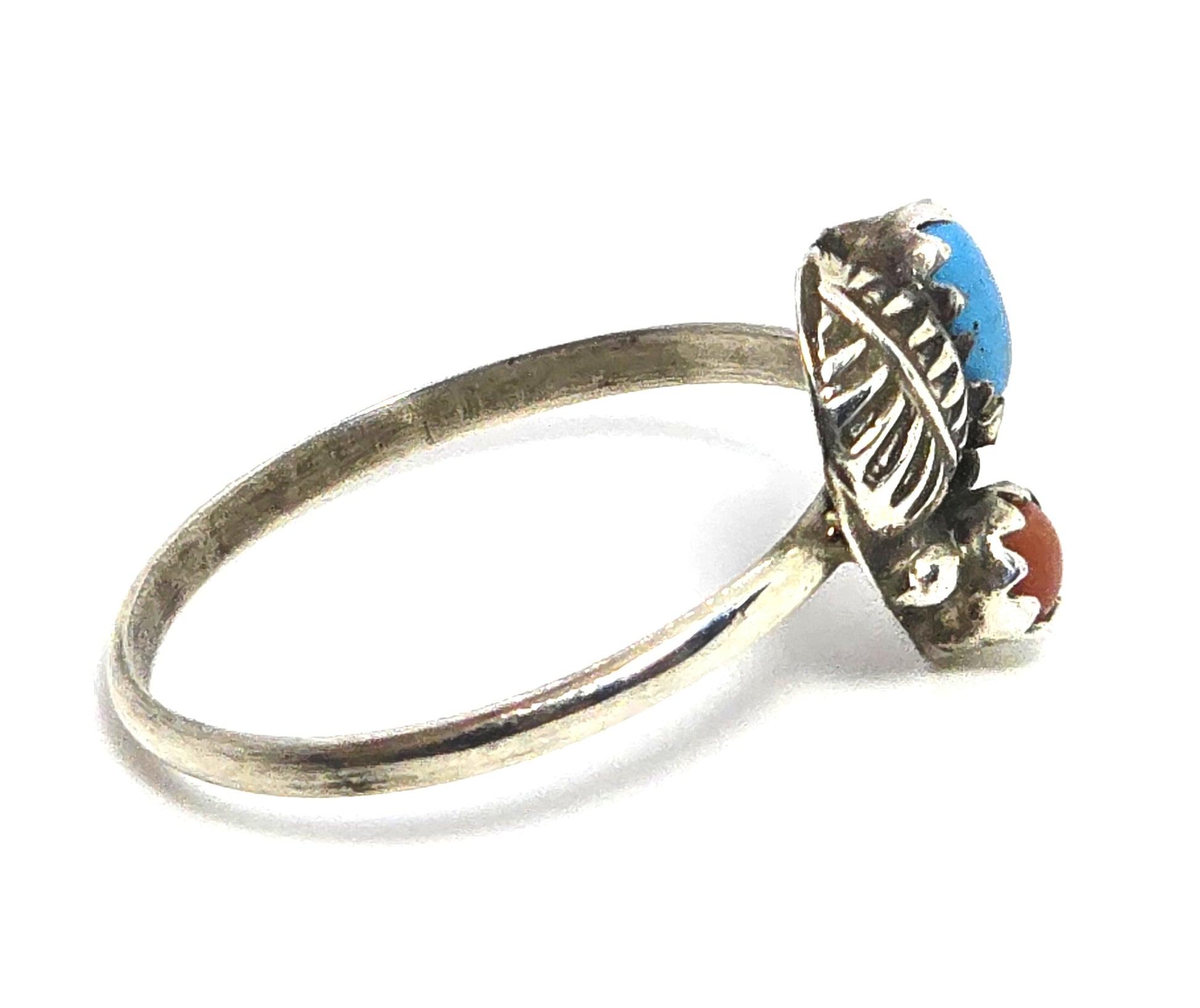 Turquoise and Red coral Navajo Native American small sterling silver ring. Hand crafted artisan sterling silver ring. Bezel set turquoise and red coral set in sterling silver with traditional feather accent. Good vintage condition with patina present.