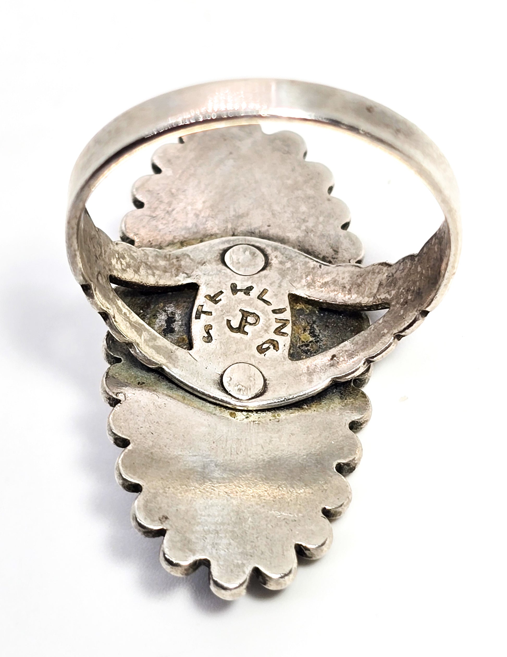Pacific Jewelry Company Turquoise Southwestern vintage sterling silver ring. Good used condition with little to no signs of normal wear. Great patina present. Stamped behind the stone Sterling JP for Pacific Jewelry company. Stamped split shank band.