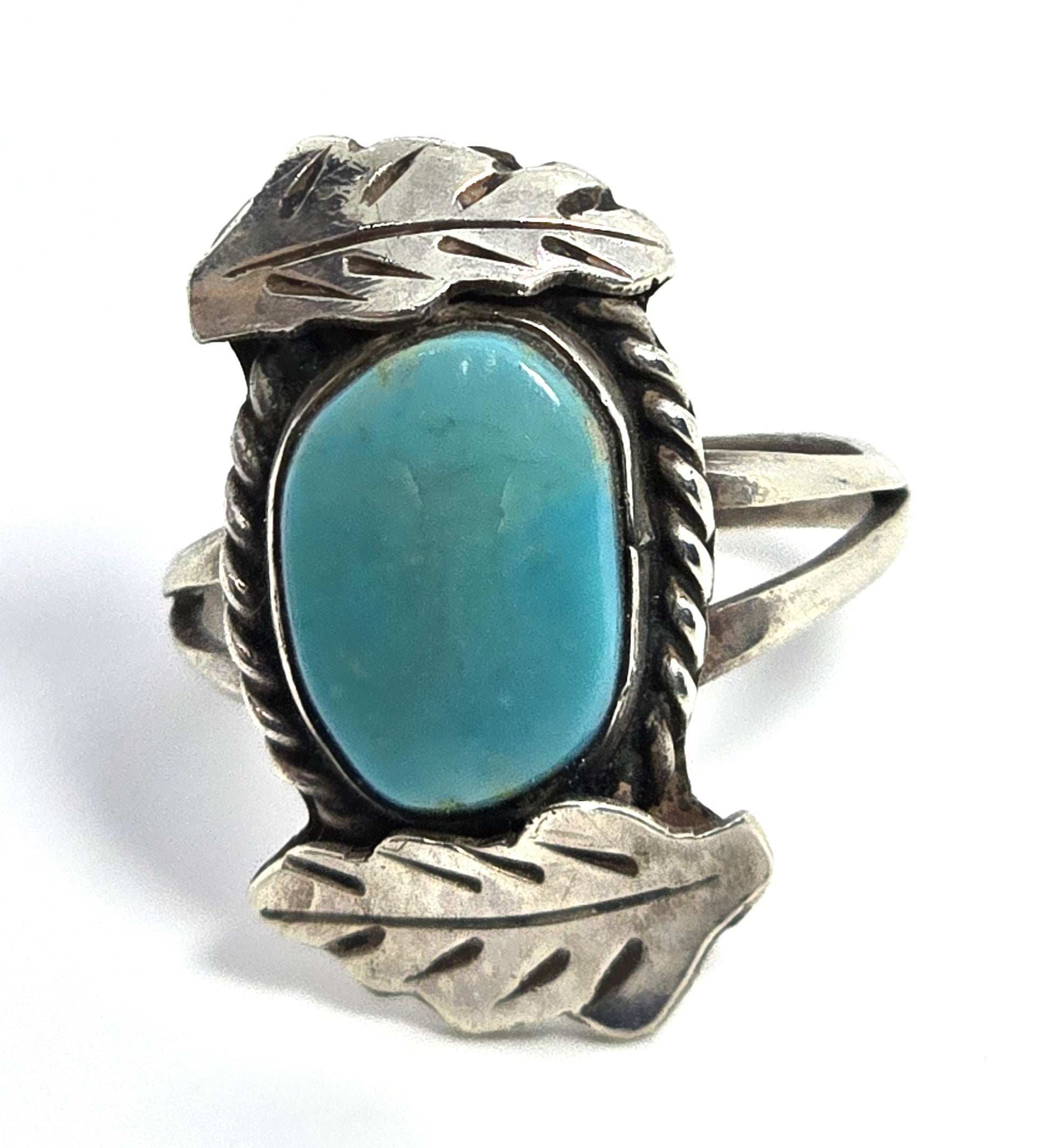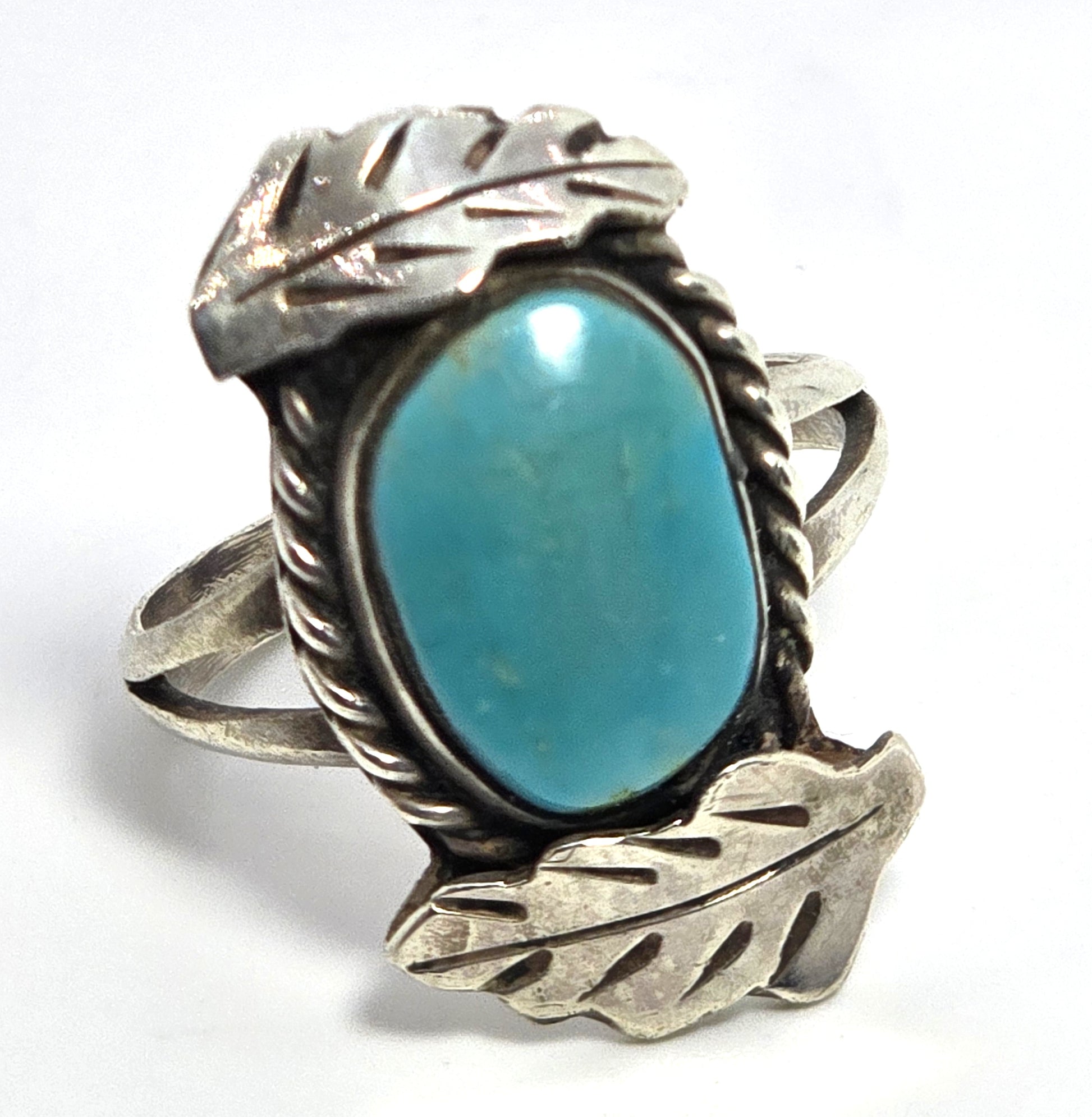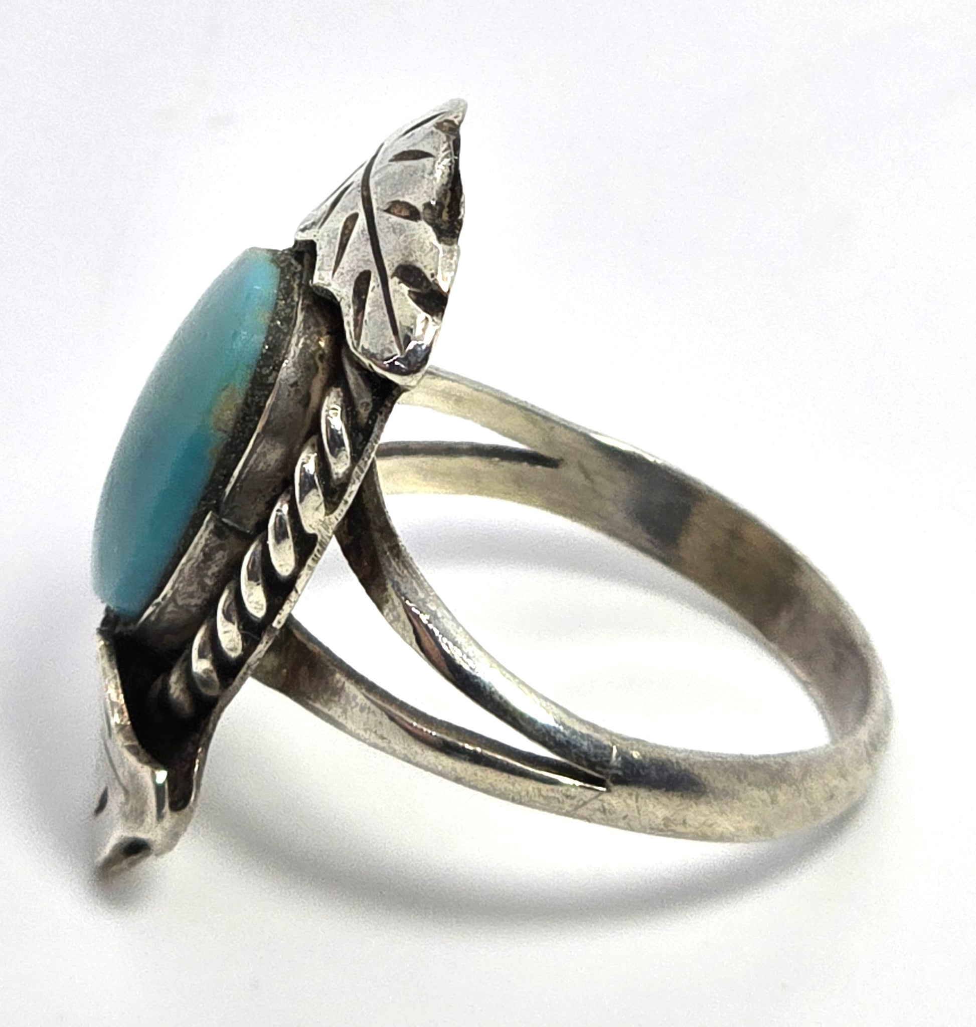 Turquoise Navajo Native American double feather vintage sterling silver ring. Good used condition with little signs of normal wear. Great patina present. Split shank band. Artisan craftsmanship. Twisted halo around the light blue turquoise stone. Framed by two handcrafted sterling silver feathers.