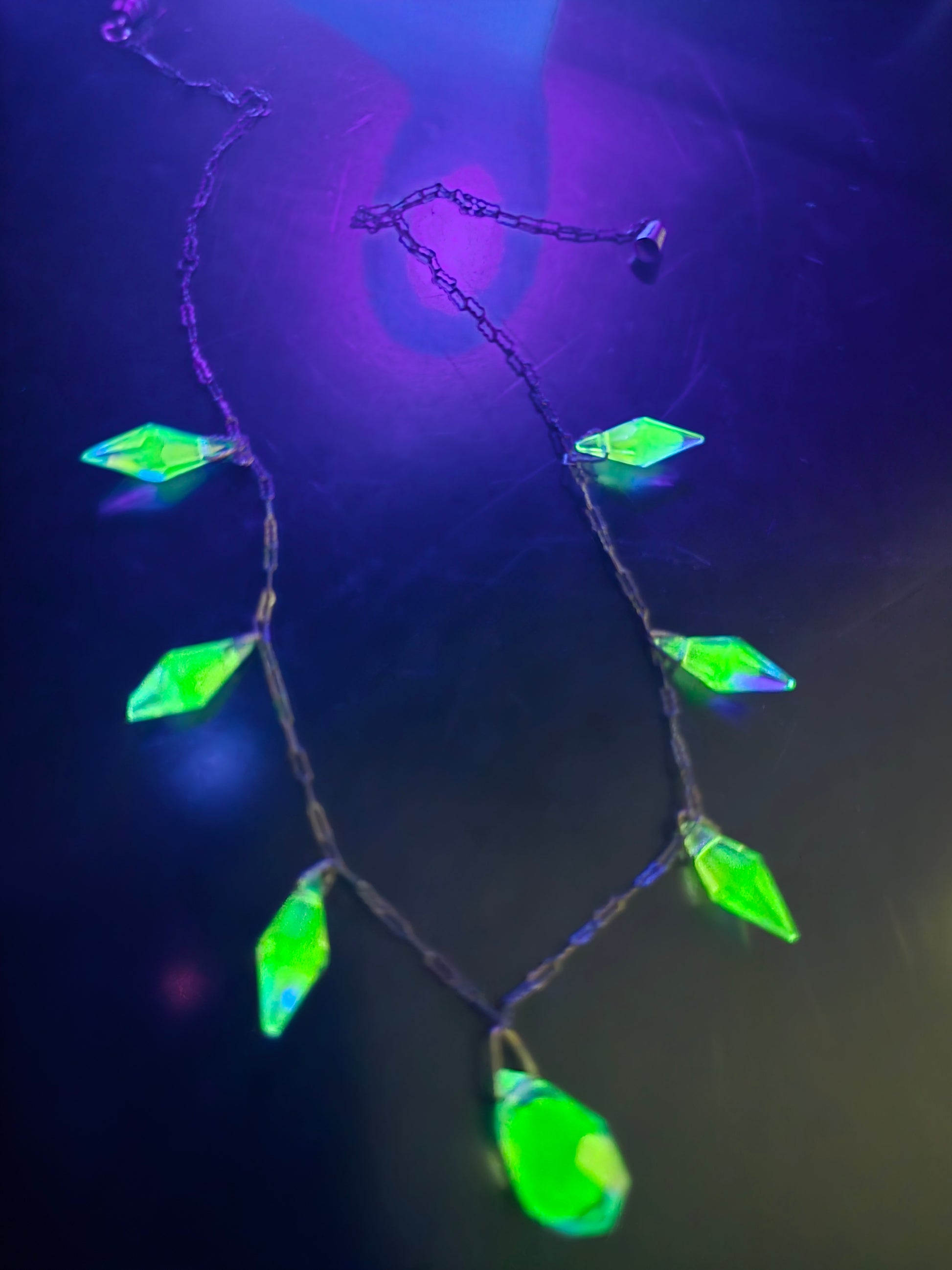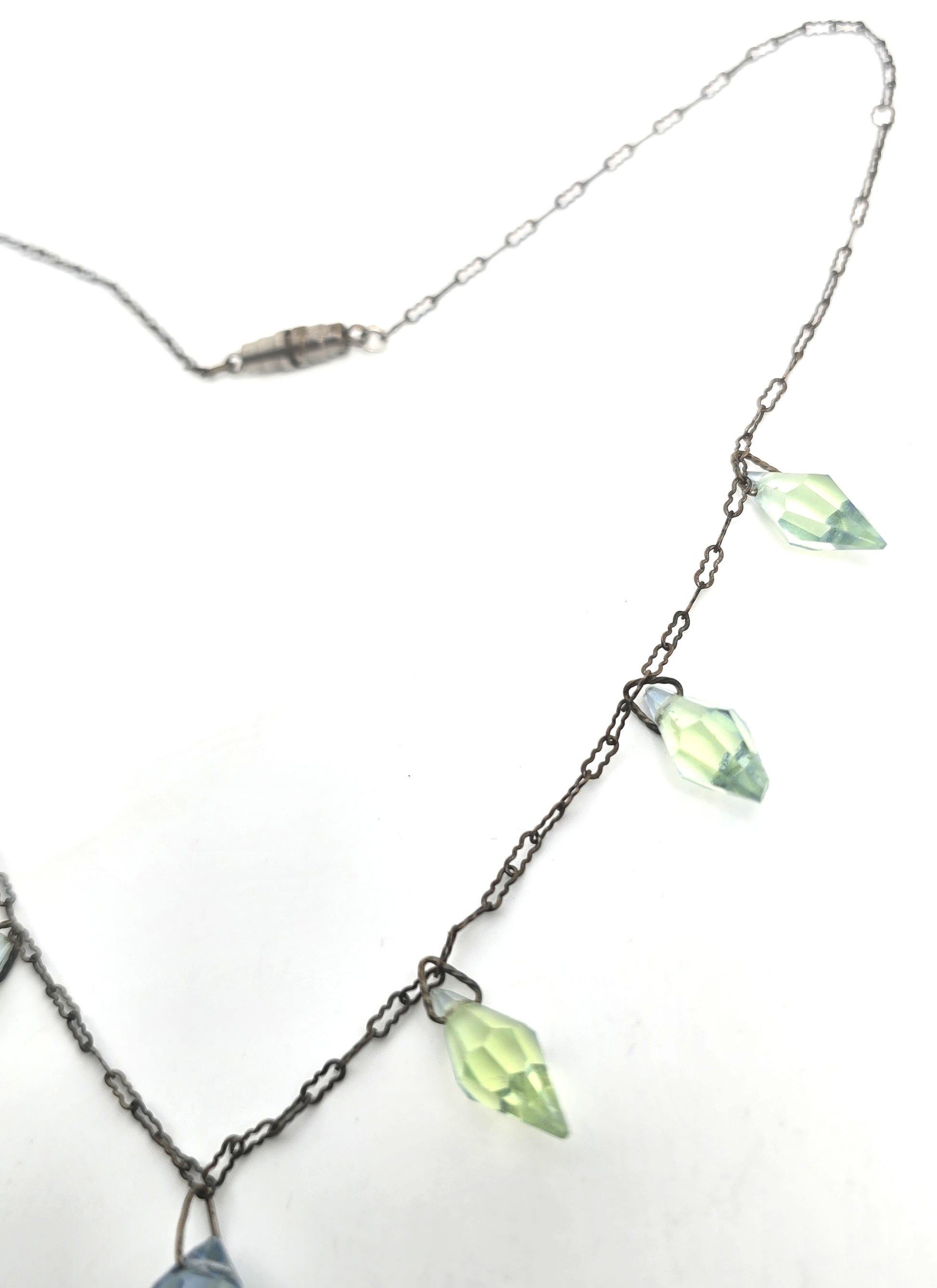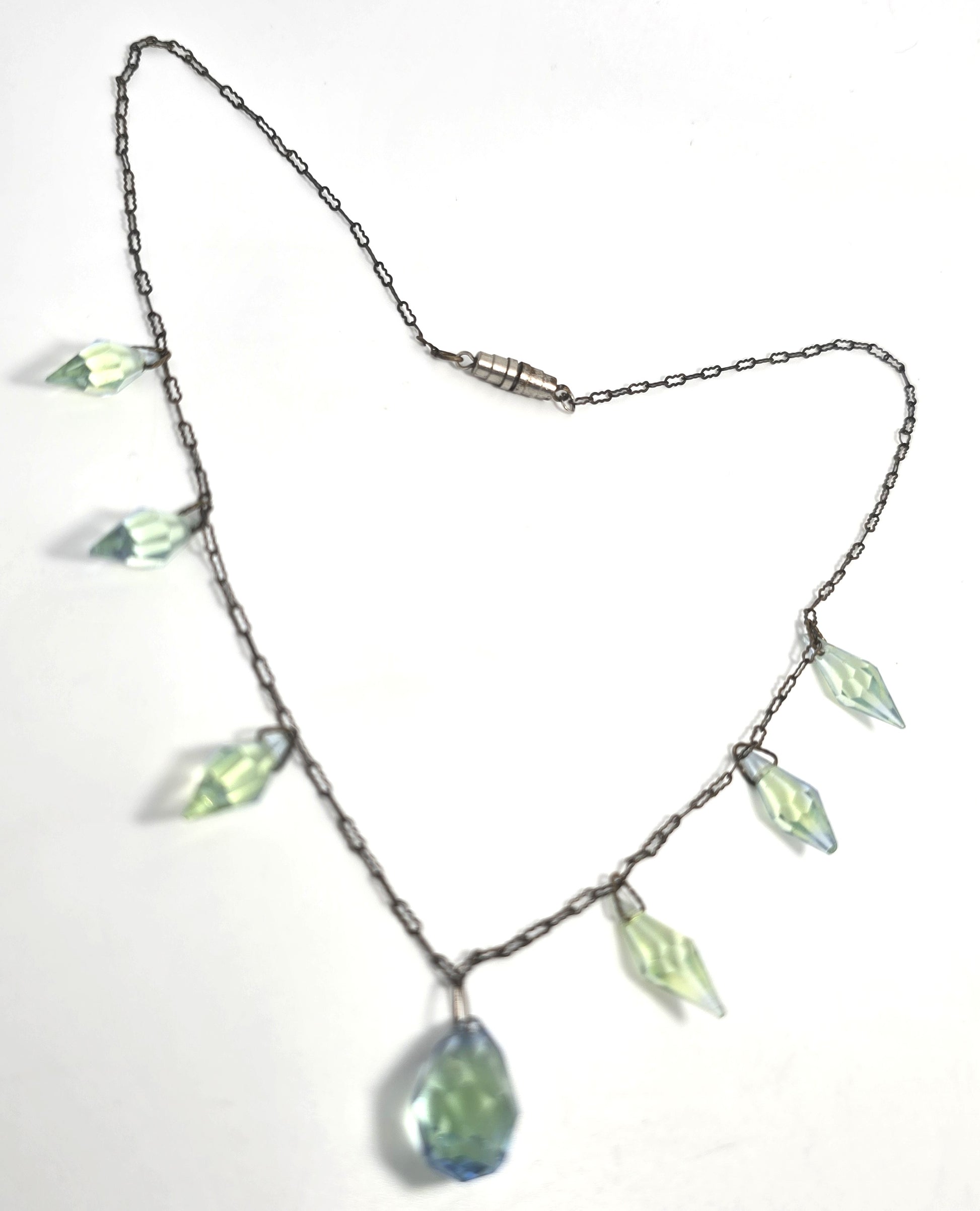 Art Deco Blue Green BI-Color Uranium Crystal Glass Dangle vintage Necklace