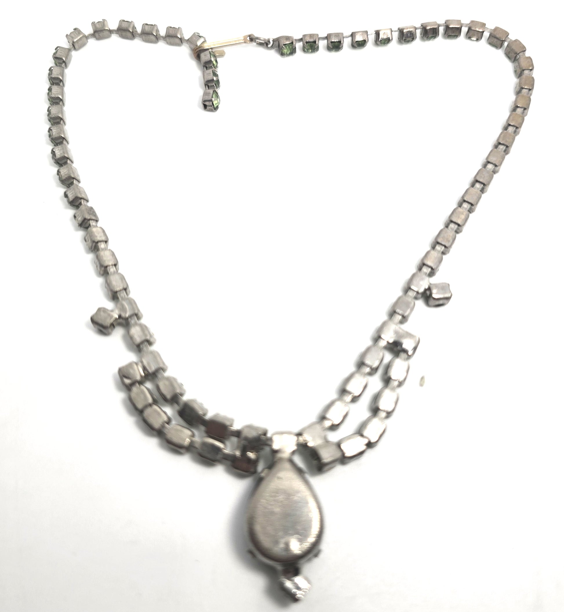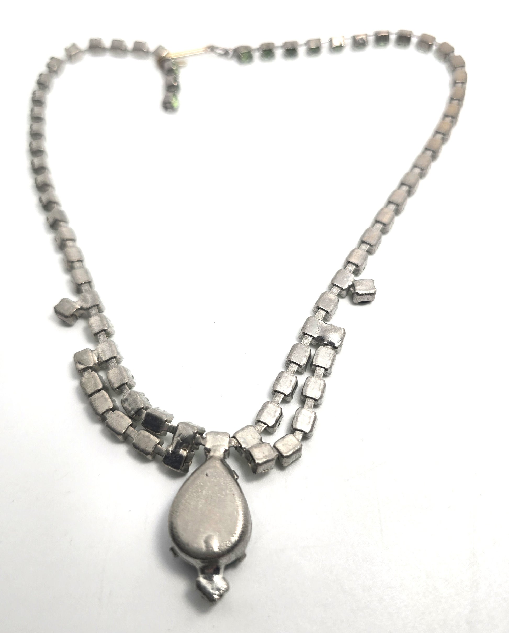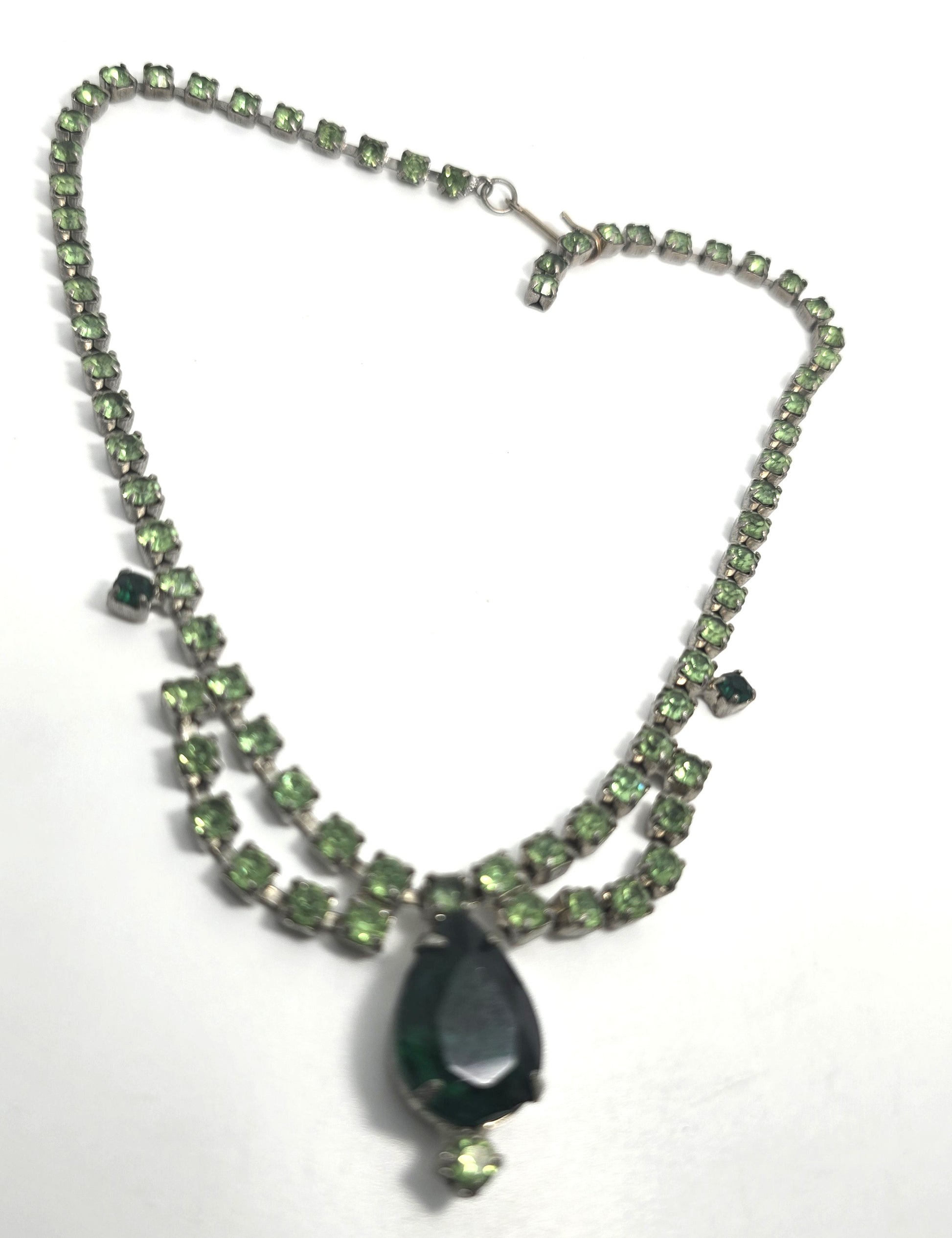 Uranium Glass scalloped deep green rhinestone vintage choker Necklace. Beautiful faceted uranium glass rhinestones. Good vintage condition with little to no signs of normal wear.. Prong set in silver toned setting. Hook clasp.
