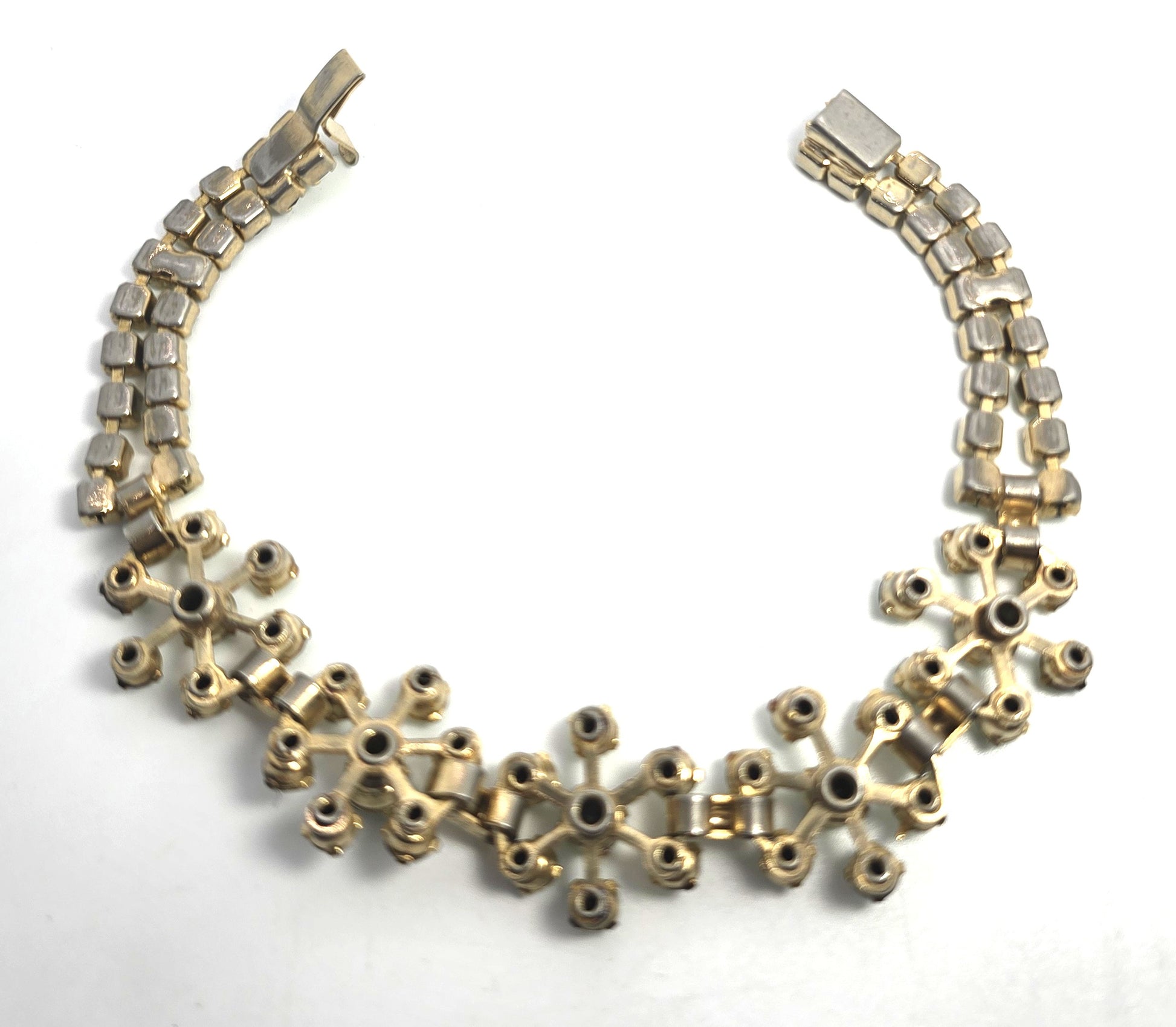 Uranium Glass green rhinestone flower vintage thick rhinestone tennis bracelet. Beautiful faceted uranium glass rhinestones. Good vintage condition with little signs of normal wear.. Prong set in gold toned setting. No missing stones.