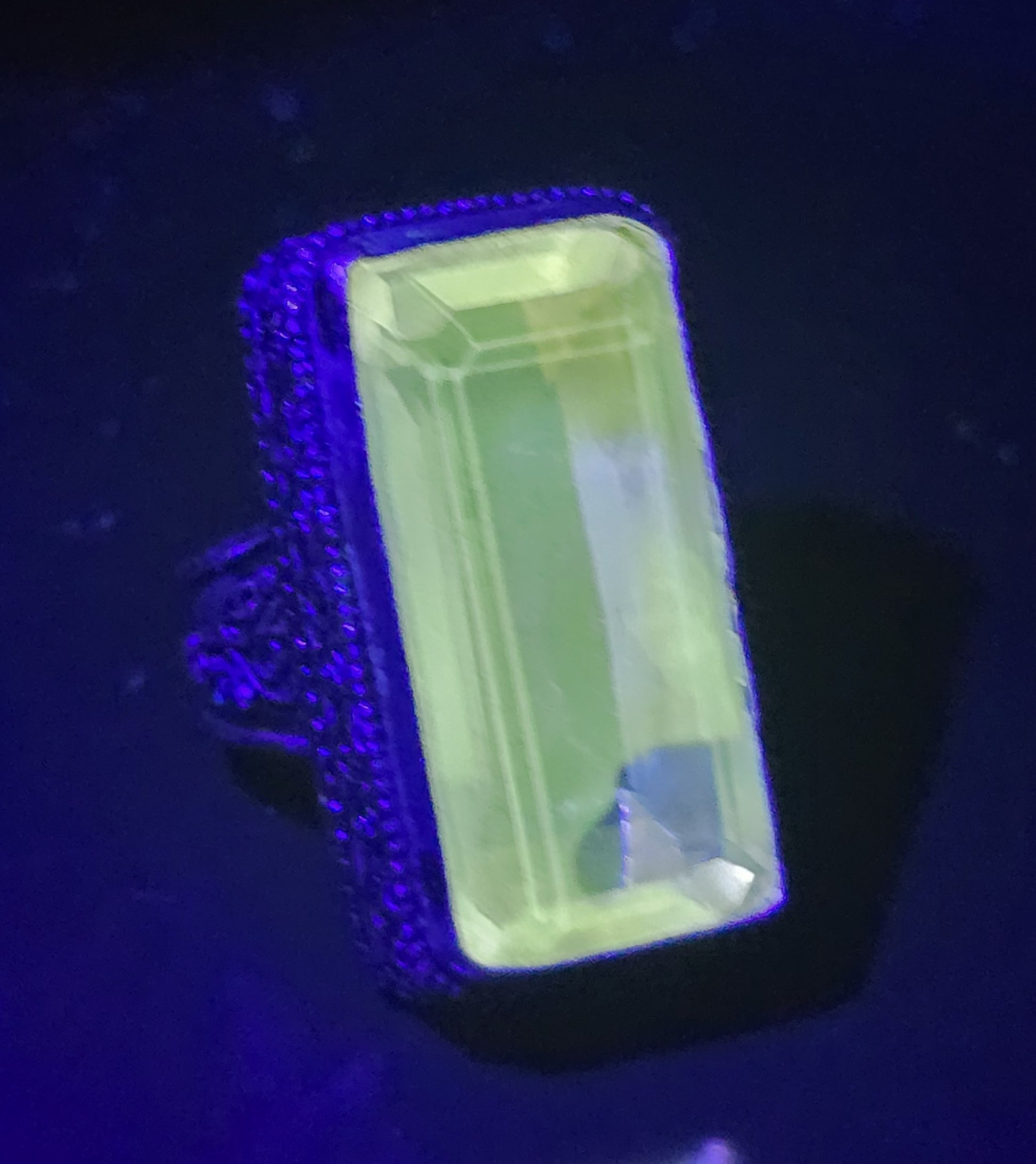 Uranium Glass UV glow Vaseline glass silver plated filigree vintage ring. Fair wearable used condition with signs of normal wear. Large faceted glass Glows under UV light. Spot on bottom right corner is cloudy with UV light. Small amount of plating loss on the band. See pictures for full condition.