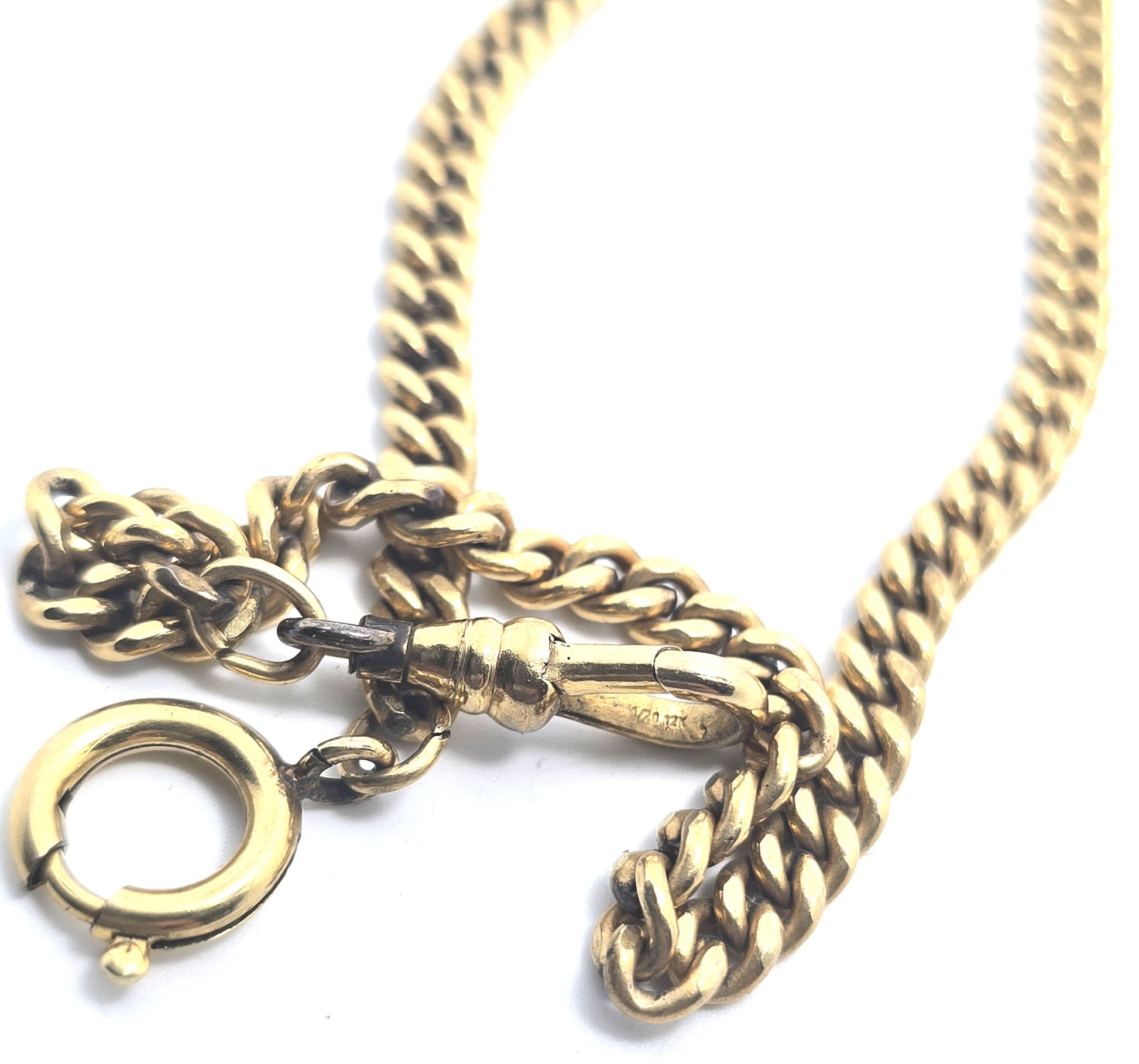 Victorian antique 1/20th 18k yellow gold filled long watch chain. Good used condition with little signs of wear. Chain is stamped on the inside of the clip and on the outside of the spring ring clasp 1/20 12k.