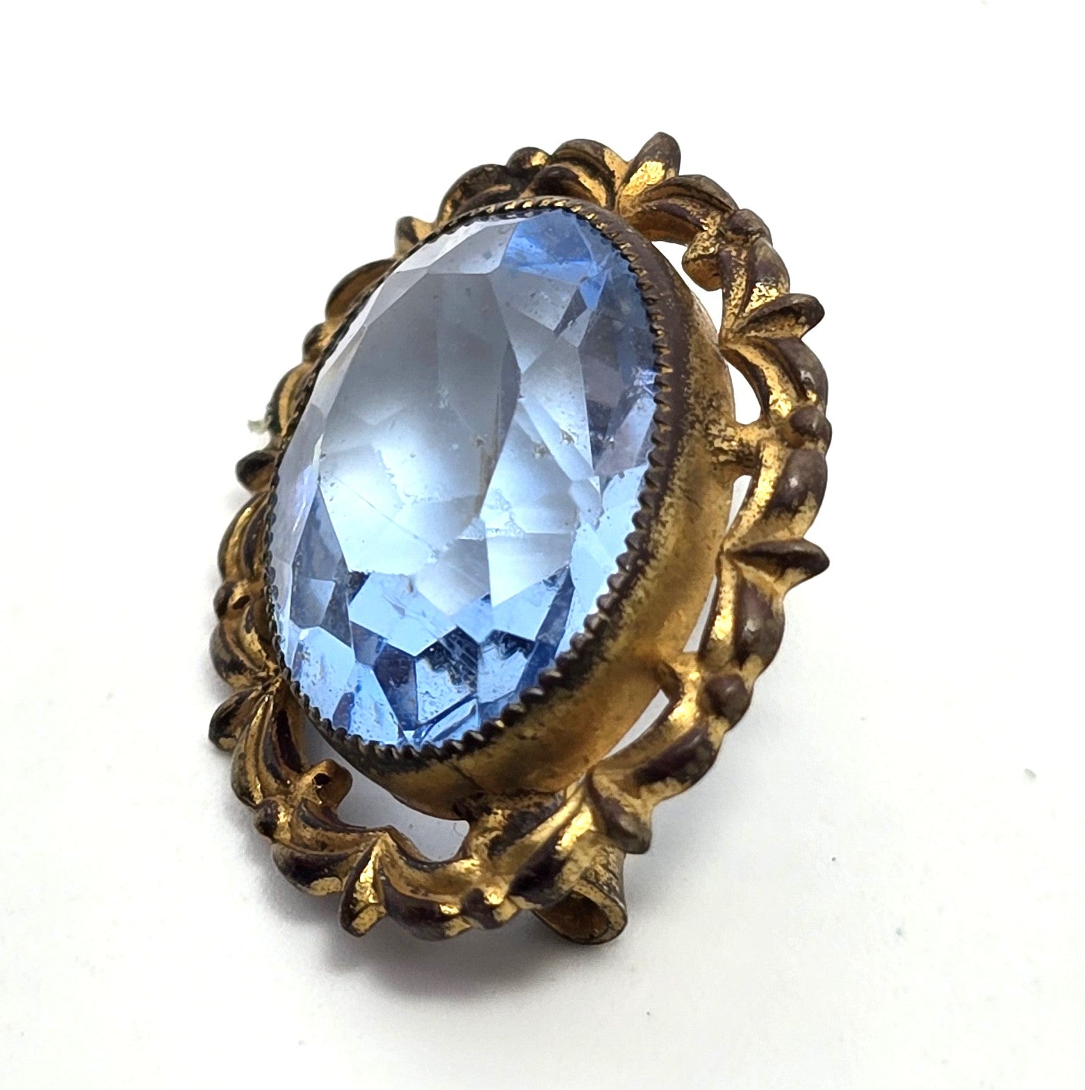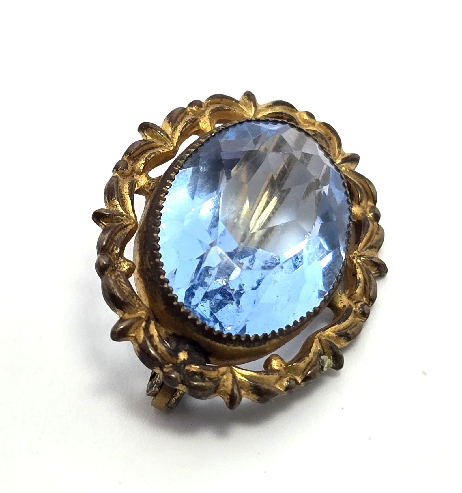 Victorian blue Czech glass stamped brass antique brooch pin. Stunning faceted blue Czech glass in pressed brass setting with bezel set and C clasp. Good vintage condition with some signs of normal antique wear as seen in pictures.