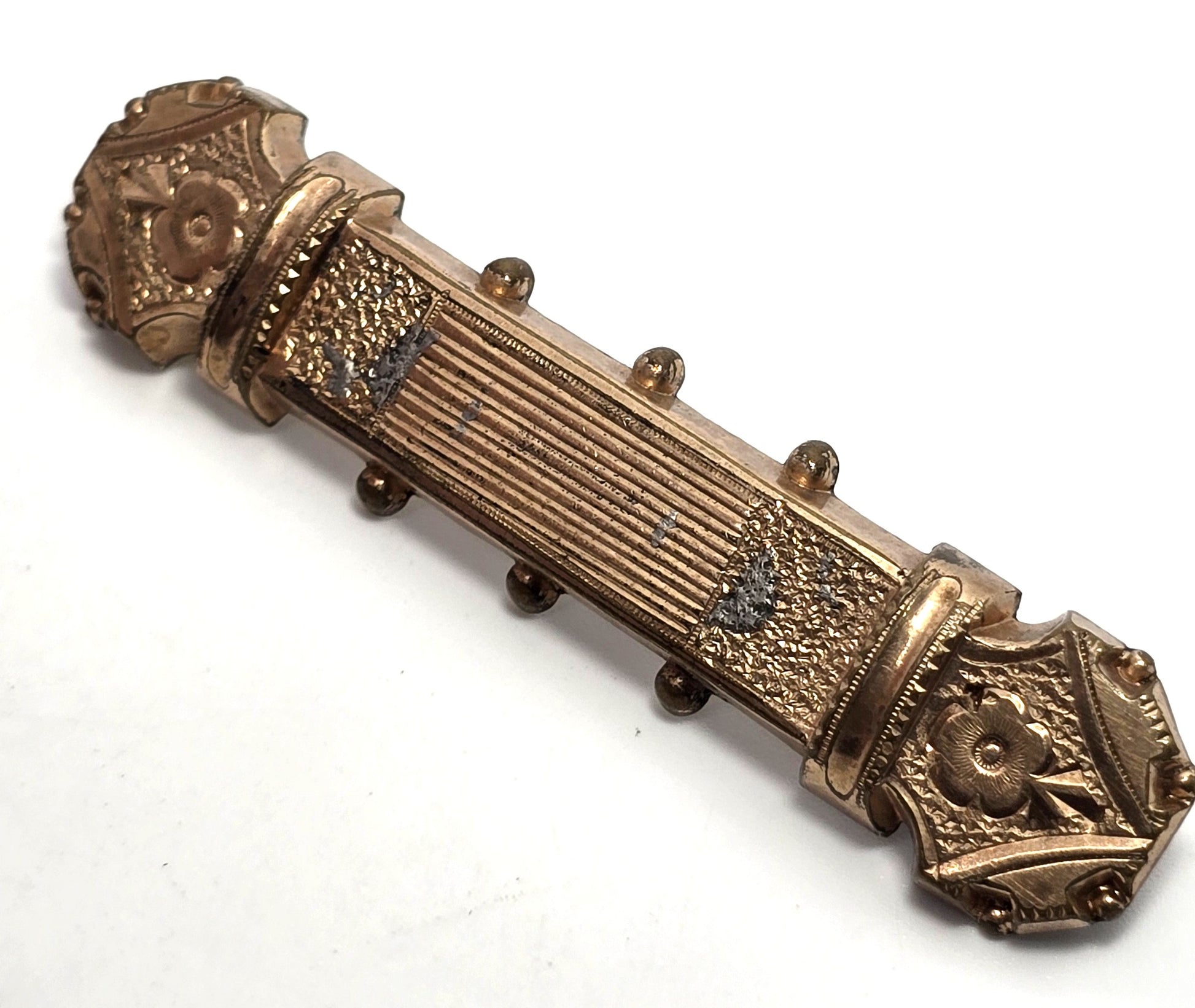 Victorian Etruscan antique etch flower gold filled vintage bar pin mourning brooch