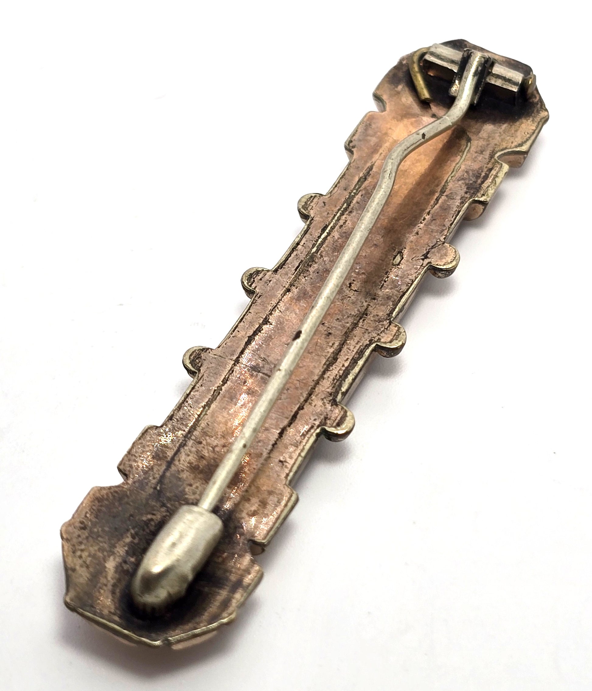Brooch measures 1/2 of an inch tall and 2 and 1/4th of an inch across.