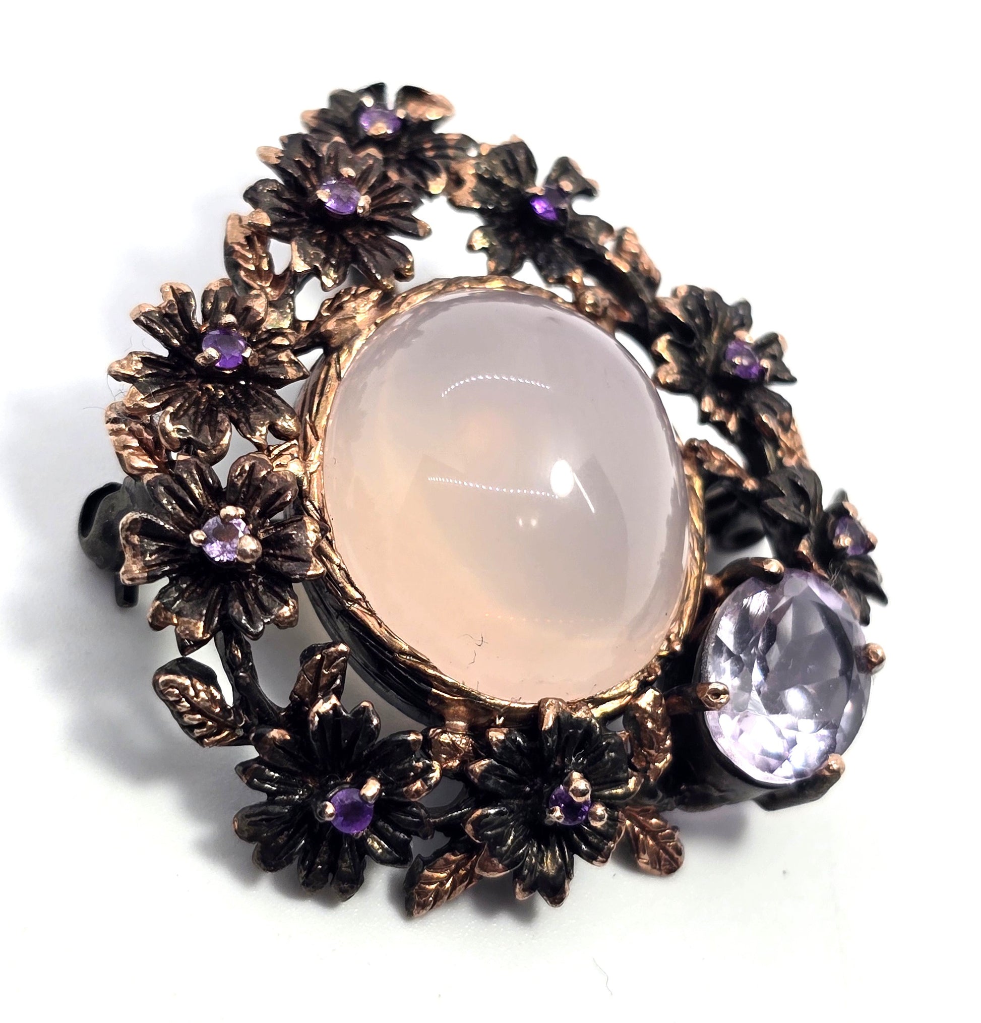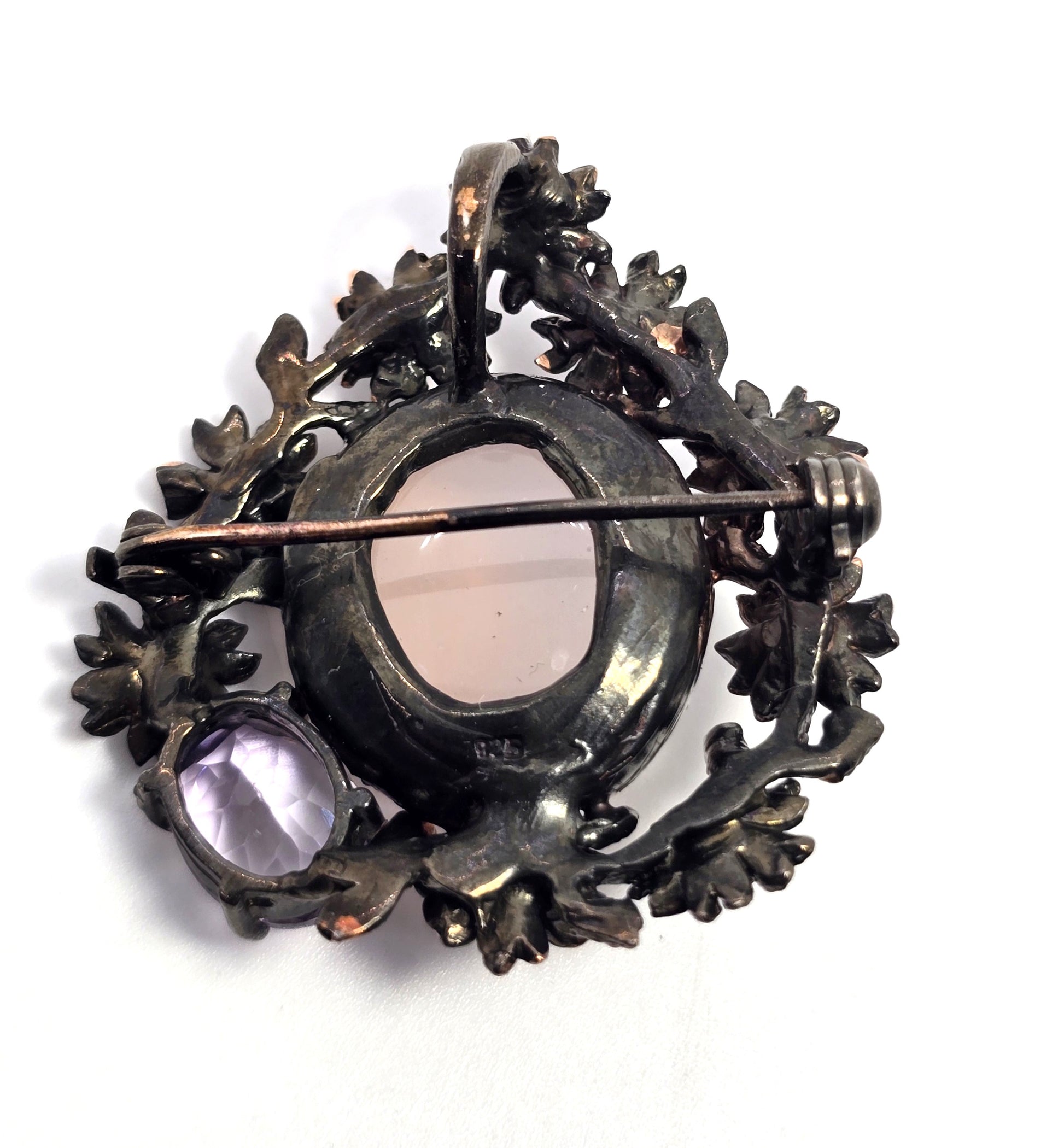 Rose Quartz Amethyst and Tanzanite gold over sterling silver pendant brooch. Good used condition with little signs of normal wear with deep patina. Rose quartz has wonderful inclusions in the pale pink translucent stone. Stamped on the reverse 925 near the bottom center.