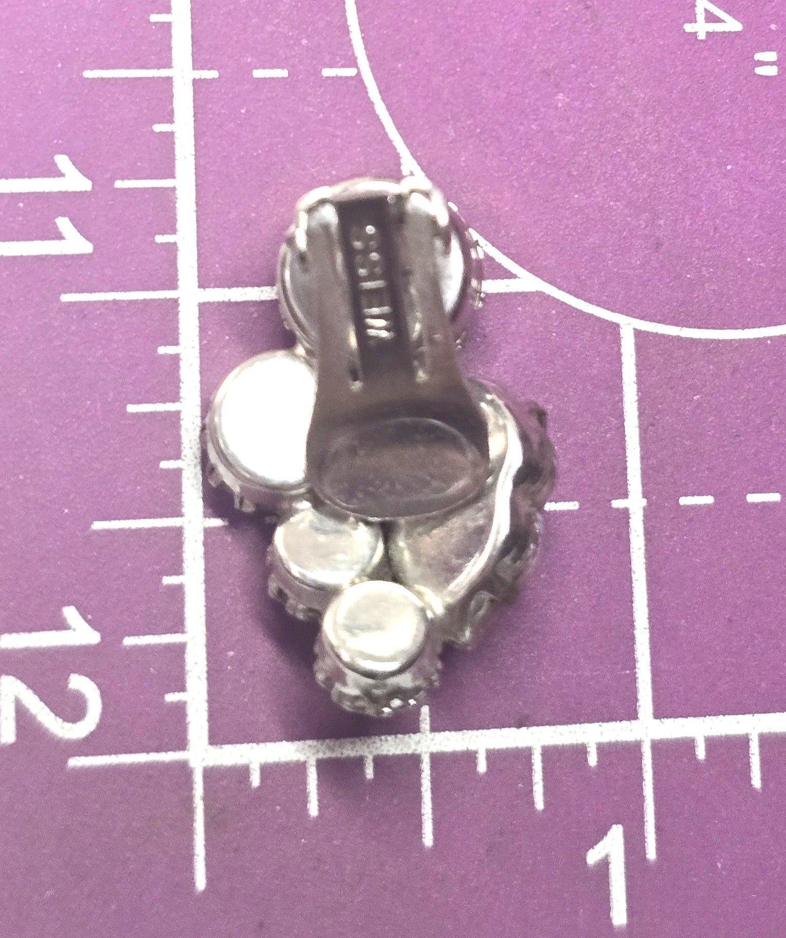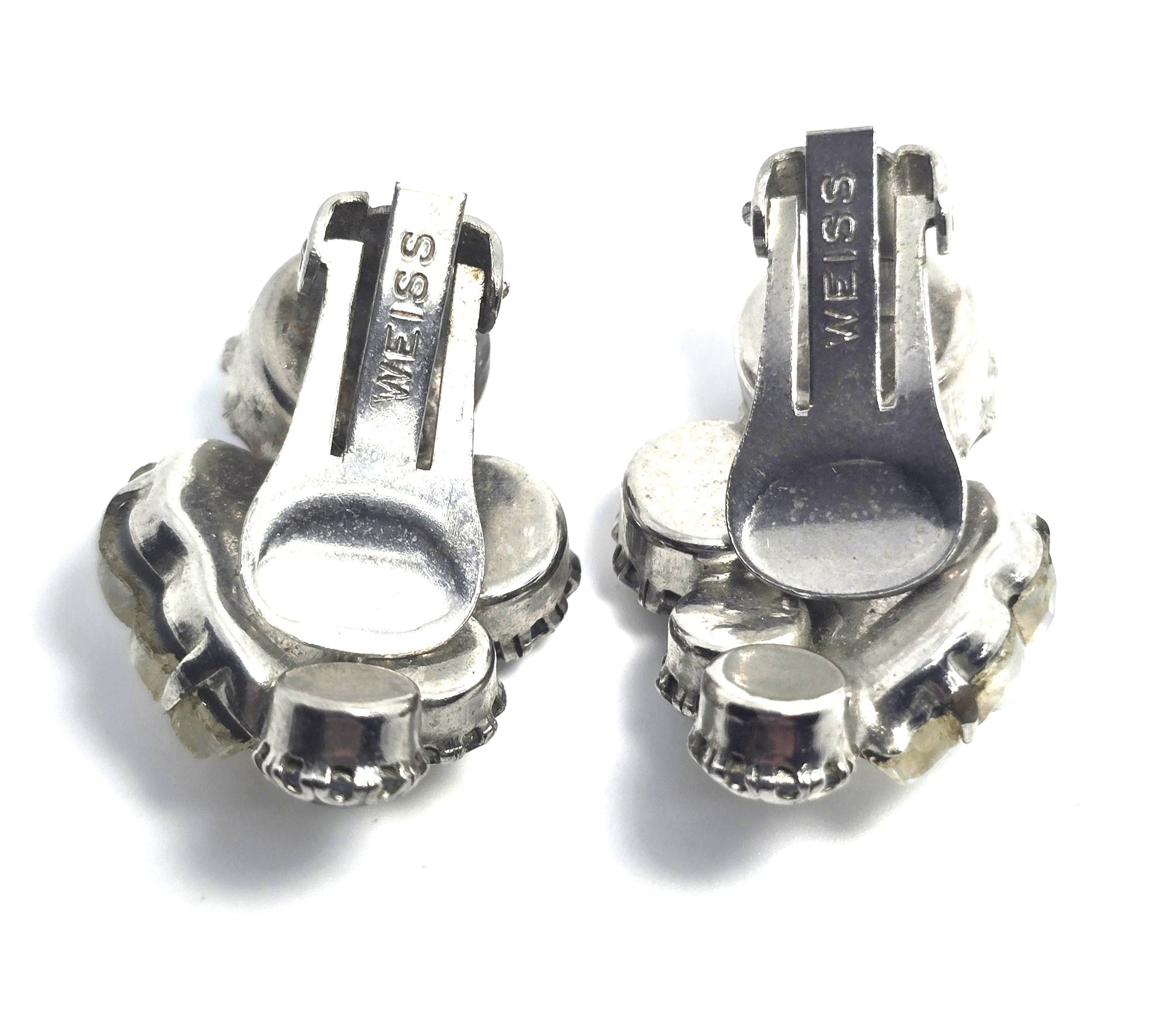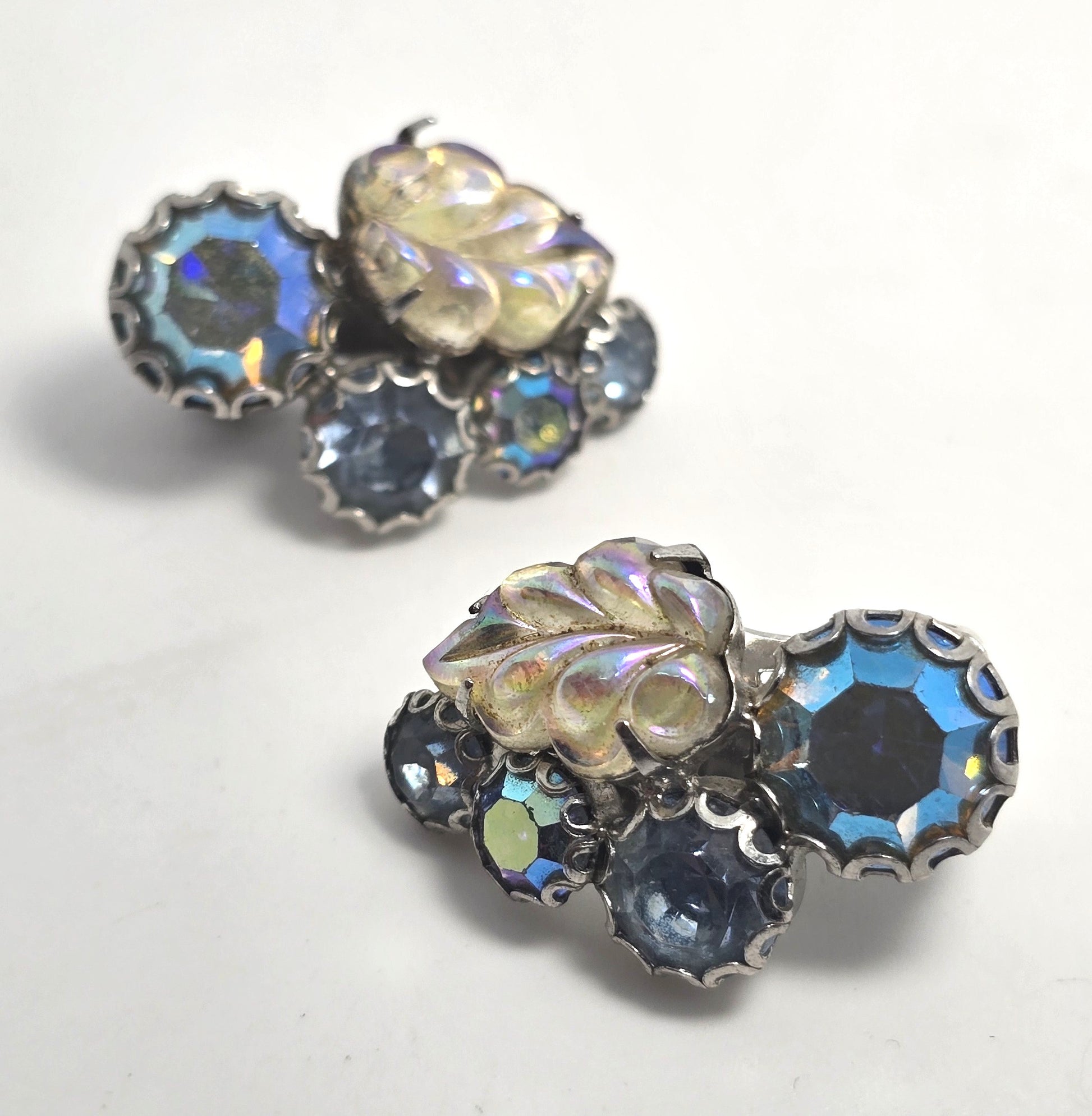 Weiss molded glass leaf blue aurora borealis rhinestone vintage clip on earrings. Good used condition with little signs of normal wear. Stamped Weiss on the back of the clip fastening. No missing or black stones. Unique silver toned scalloped prong setting.