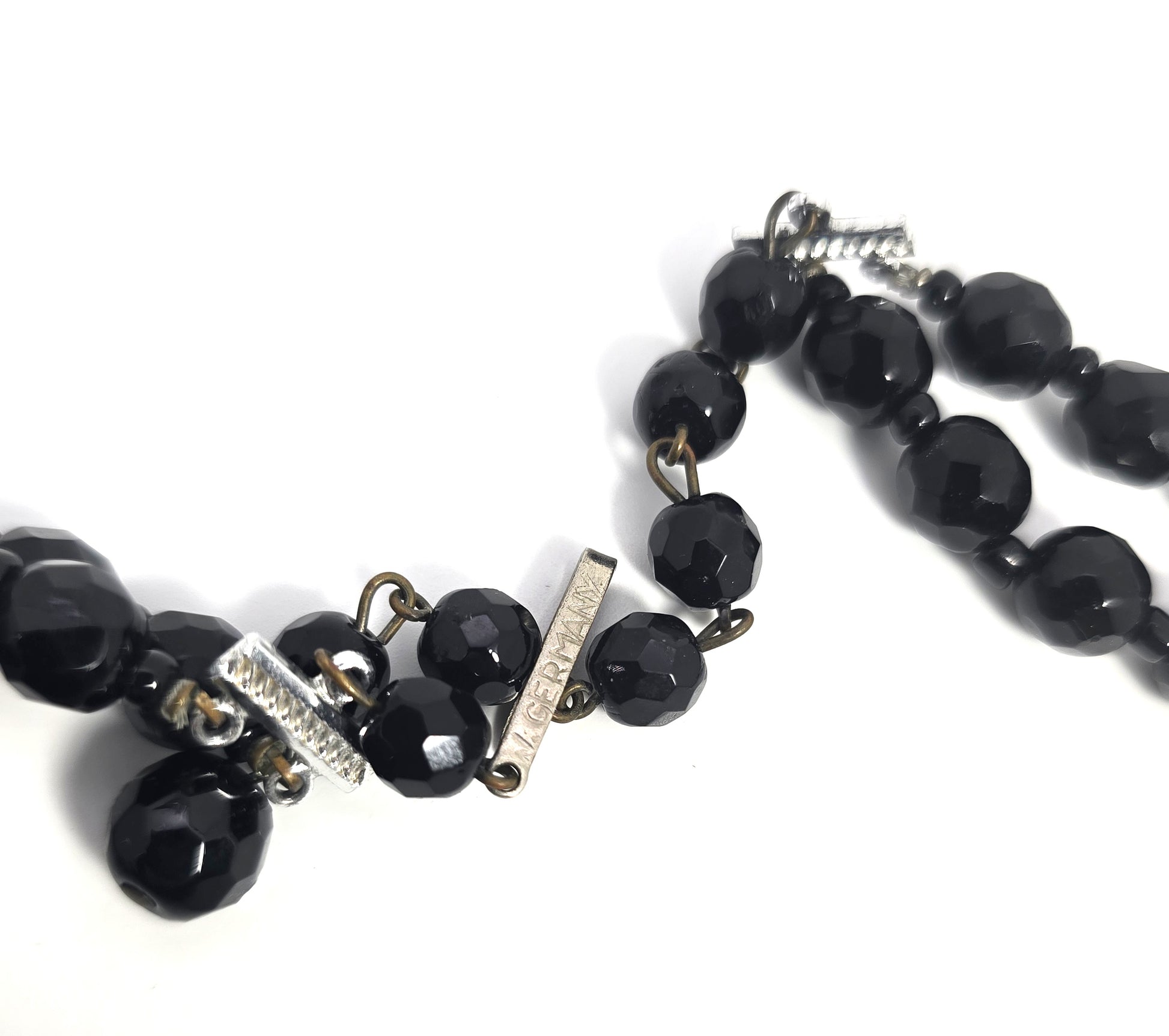 West Germany black faceted 2 strand graduated beaded vintage necklace. Large faceted black beads are offset by alternating small faceted seed beads. Good vintage condition with little signs of normal vintage wear. Hook clasp is stamped W Germany on the hook