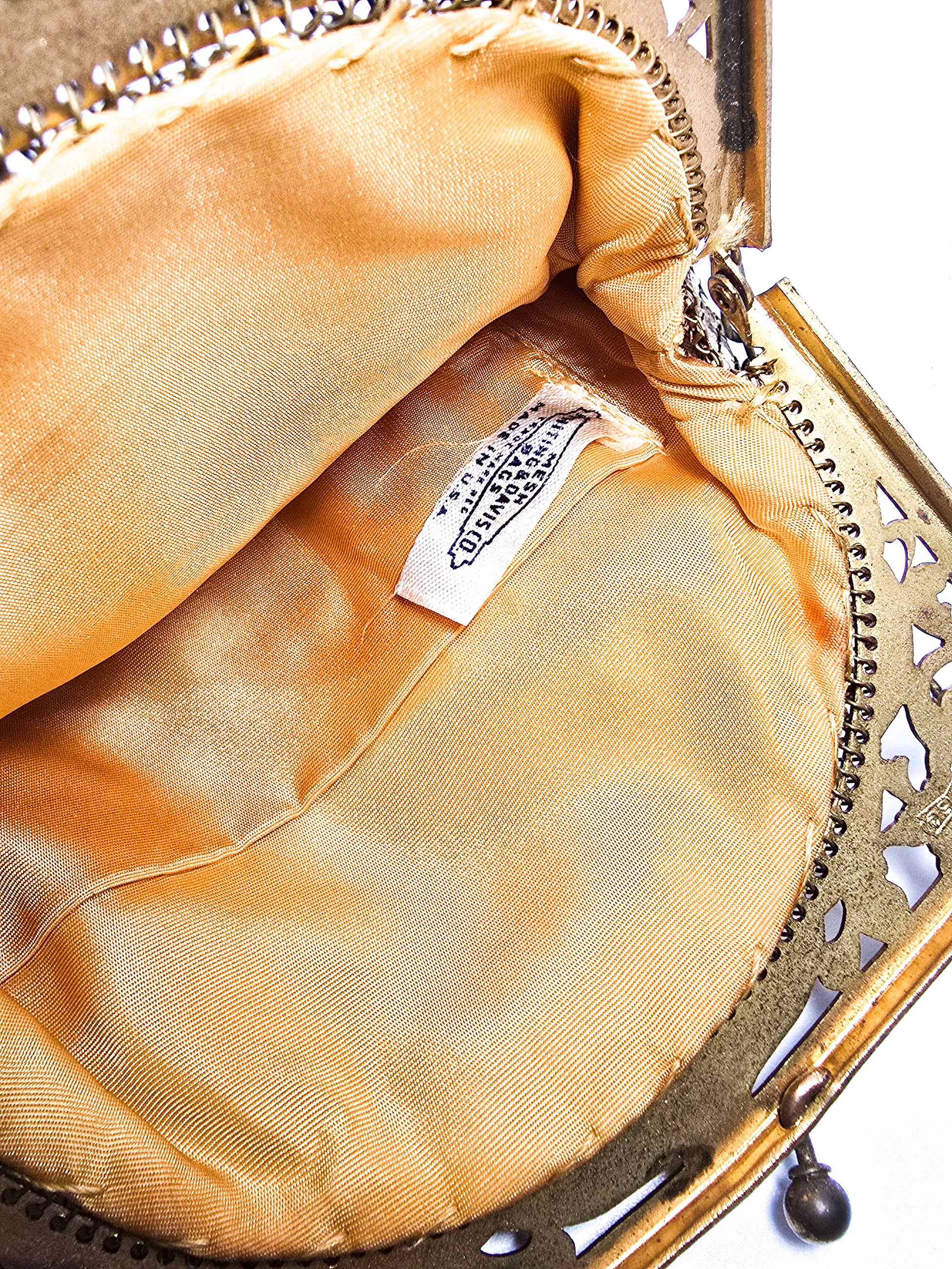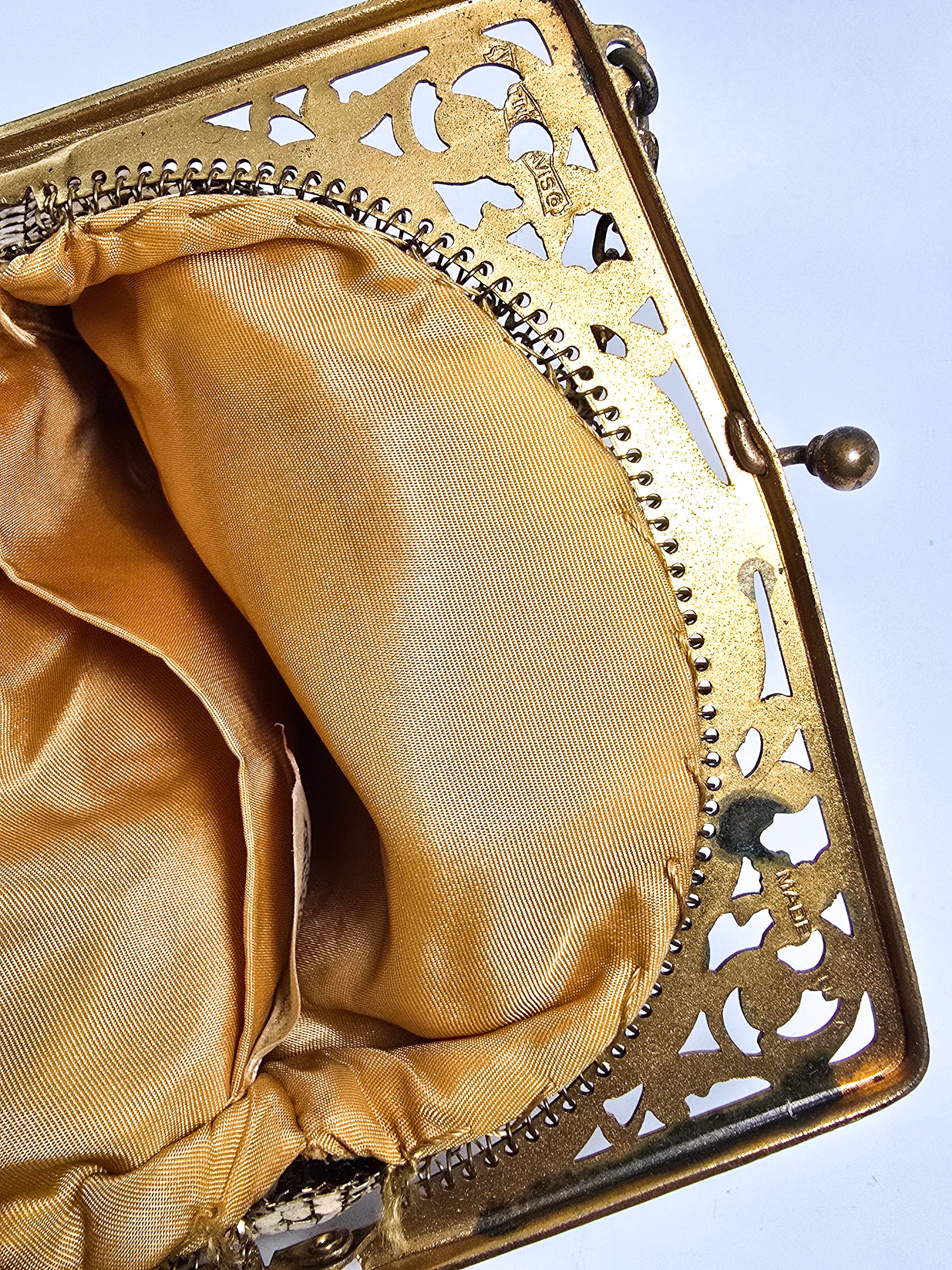 Whiting and Davis mid century vintage gold mesh metal clutch purse with strap